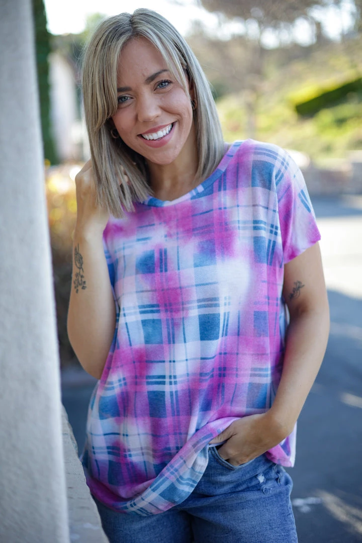 This plaid, tie dye top makes life so much fun! Best part…this top can be worn both ways. With a relaxed fit, this top features a round neckline with v-back and twist detail.