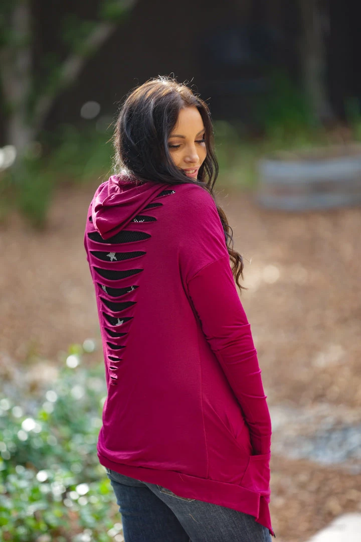 All cozy and a little bit of edge!Β The laser cutout on the back over the mesh detailing, really gives this piece a unique look. With a relaxed fit, this top features long sleeves, front zipper and kangaroo pockets.Β