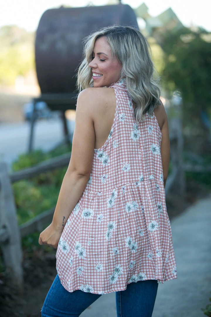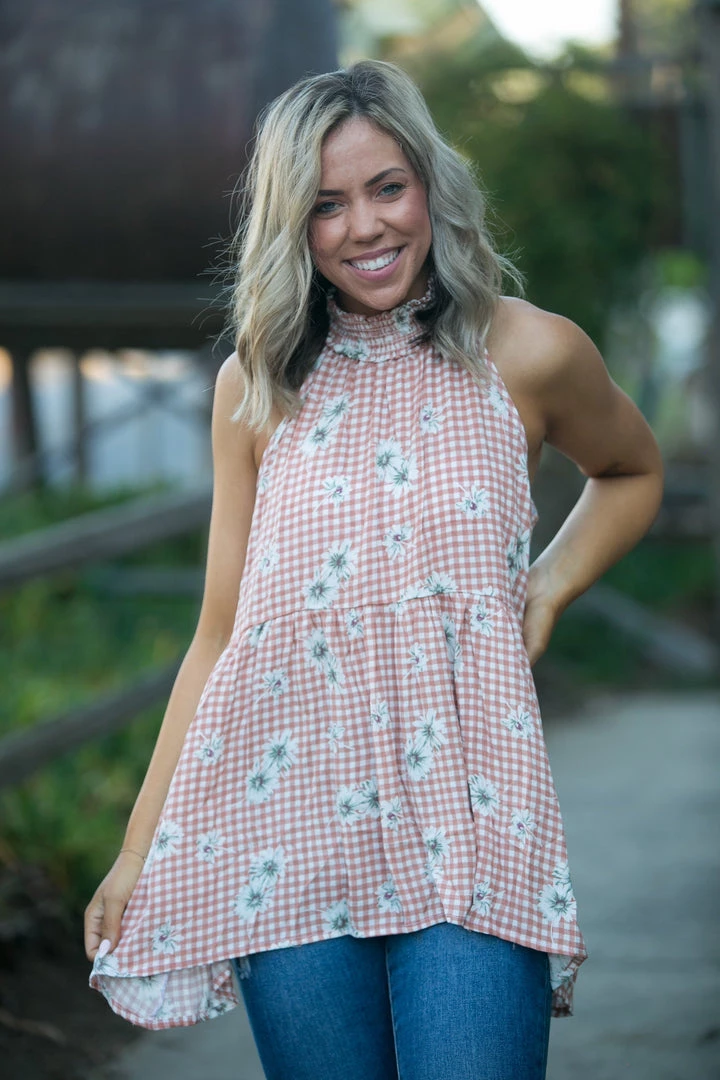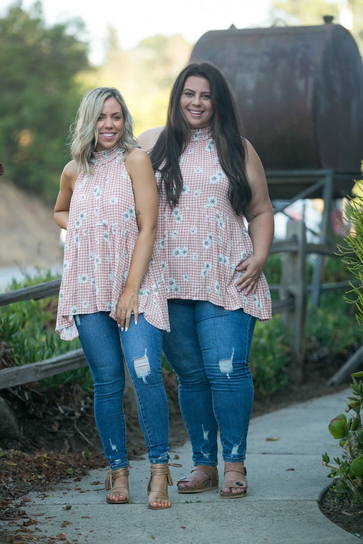 Oh wow! This babydoll is such a perfect transitional piece that you can wear year round. The rust colored gingham brings such a warm feeling to this daisy printed top. With a relaxed fit, this sleeveless babydoll features a smocked mock neck with a back buttoned closure and hi lo hem.