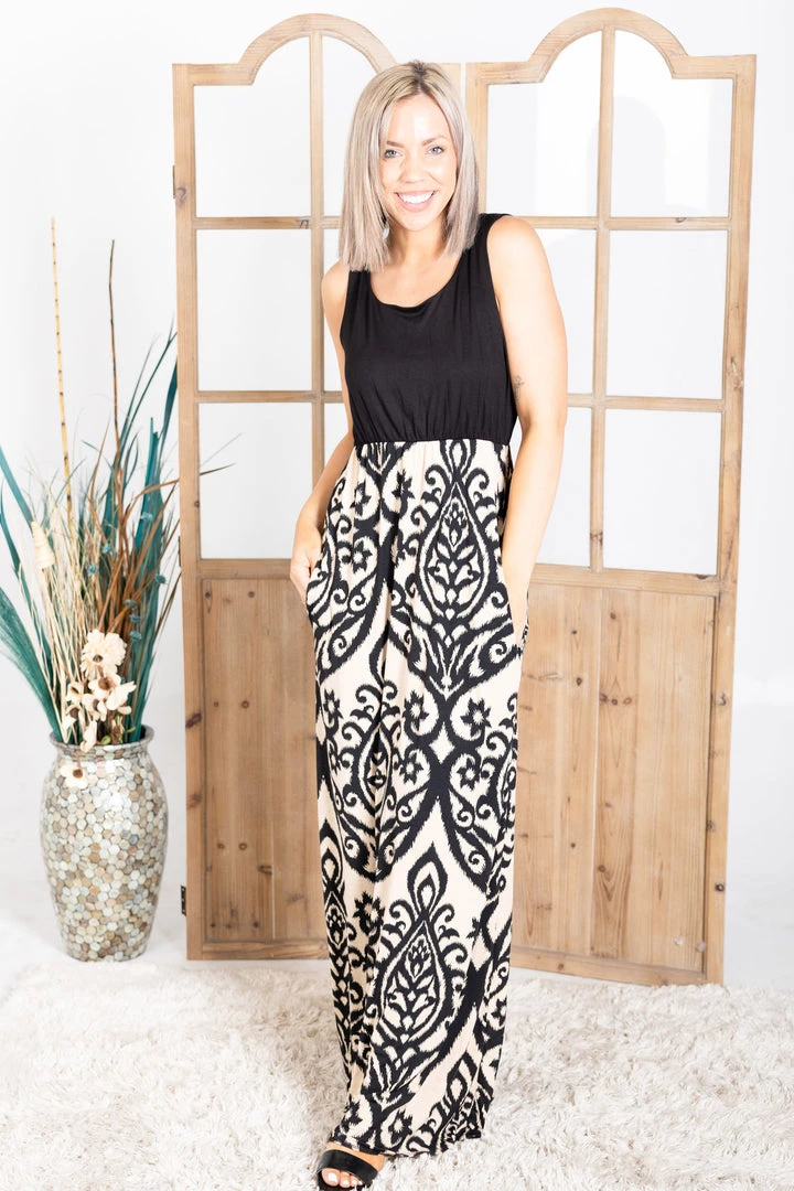 This sleeveless maxi is one of our absolute favorites. With a semi fitted silhouette, this dress features a scoop neck and side pockets.