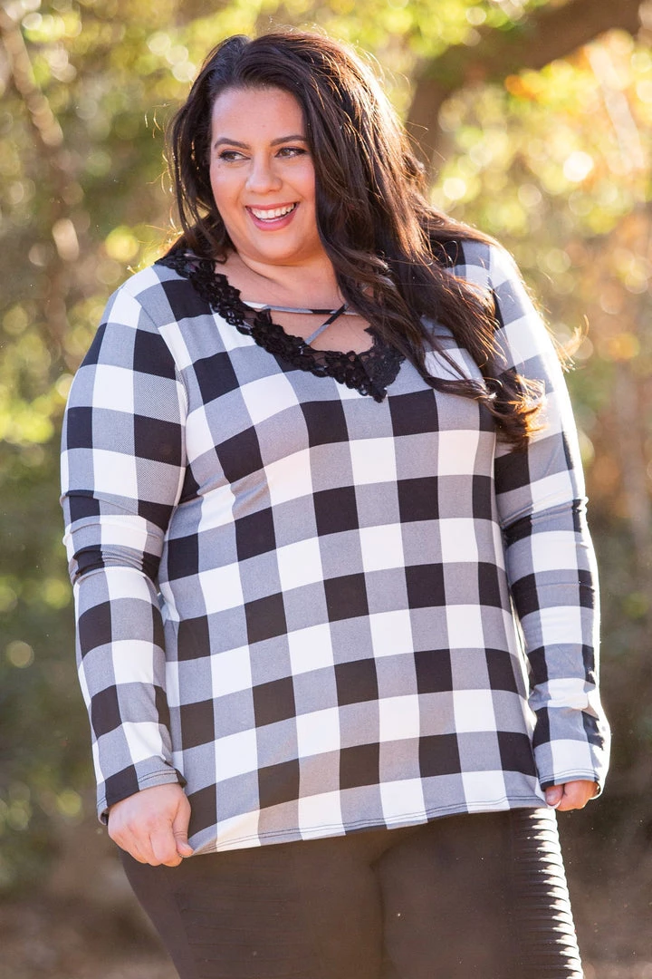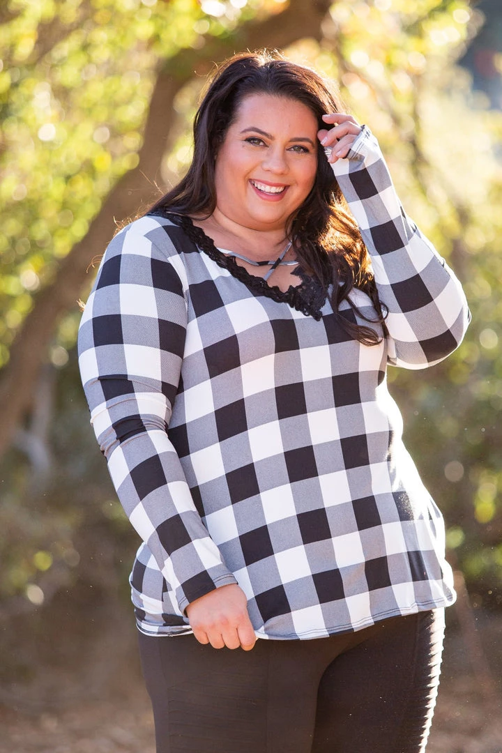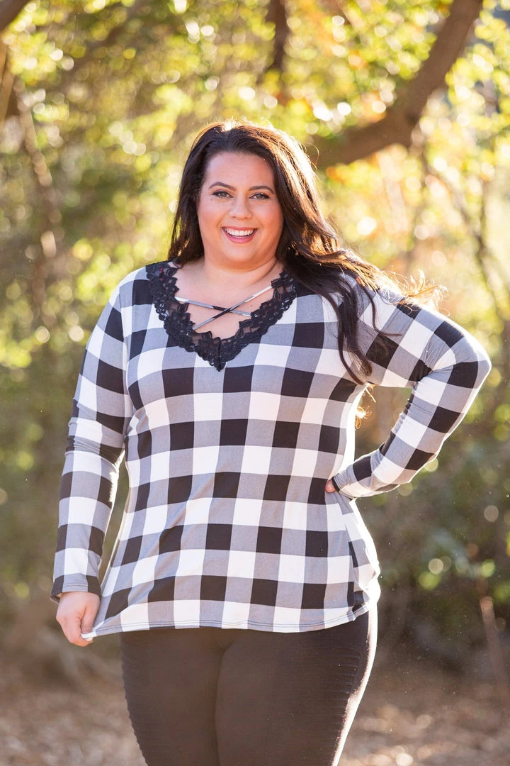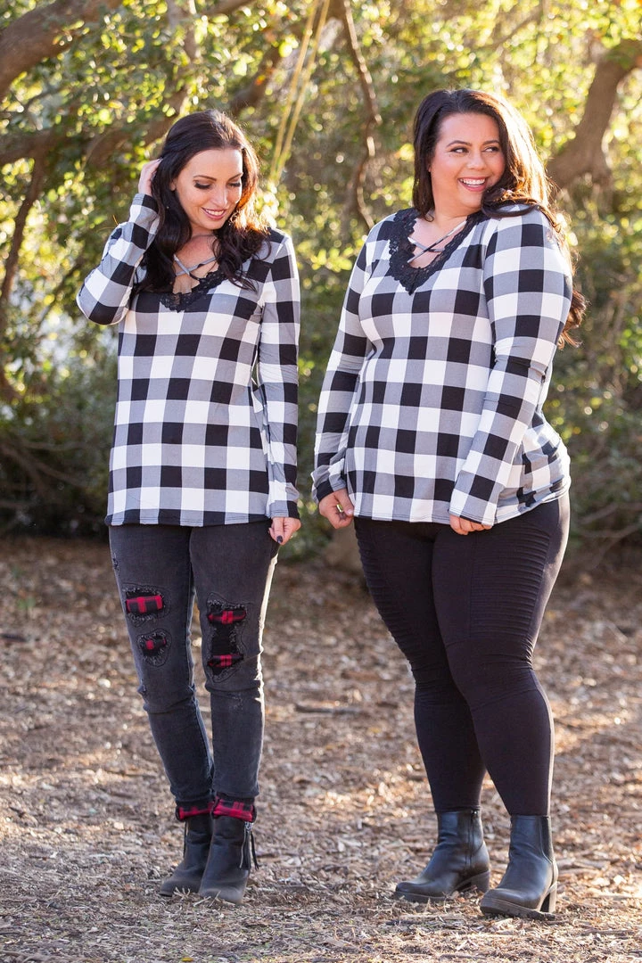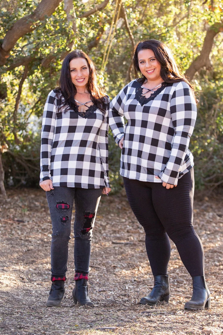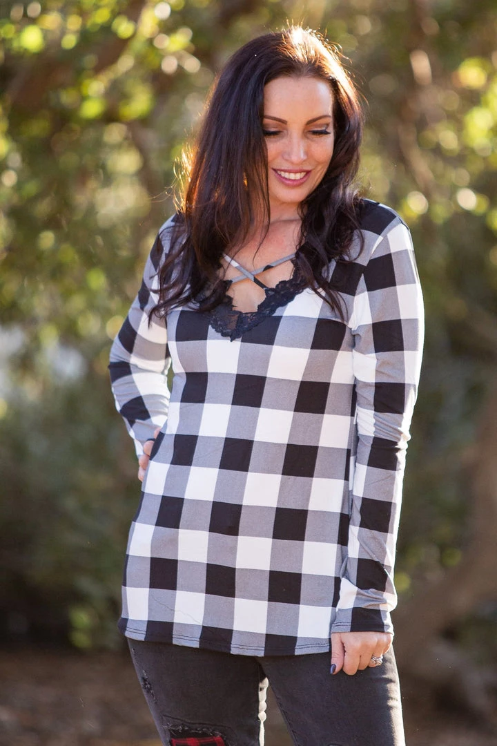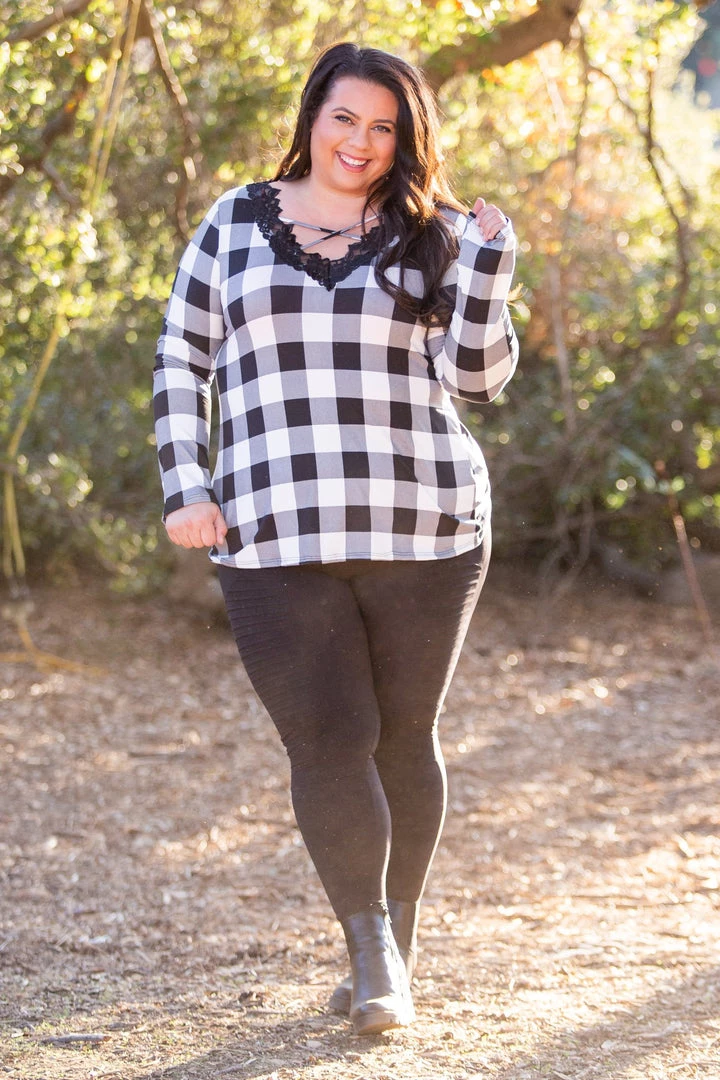 This long sleeve top is one of our absolute favorites. The bodice is made fromΒ anΒ the most buttery soft fabric imaginableΒ and it features a v-neck with scalloped lace detailing and criss cross straps across the chest.Β