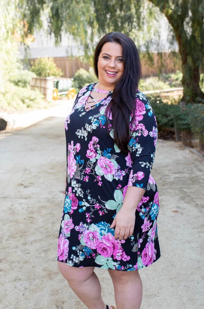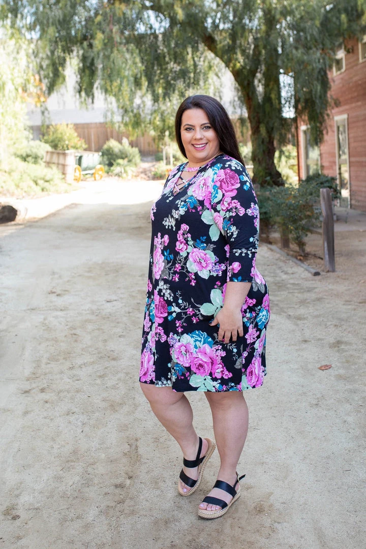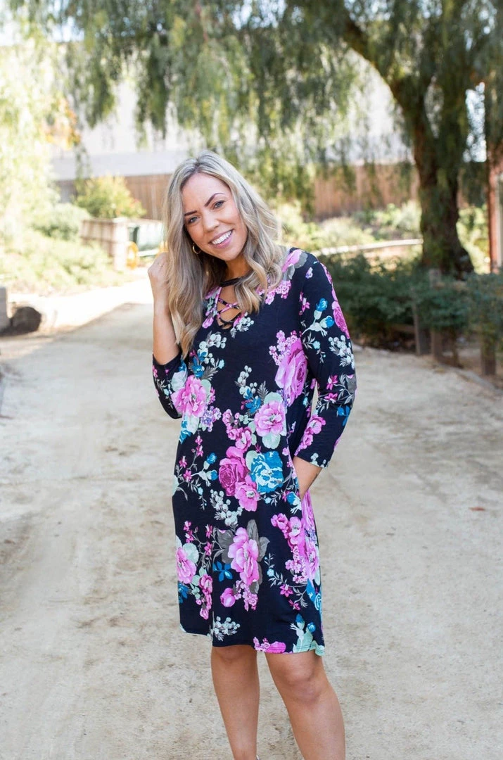 This dress will impress everyone that sees you wearing it! Made from bulgari fabric, this dress has the perfect flow on all body types and features a v-neck with criss cross detail, 3/4 sleeves and pockets!Β Β Β Β Β Β