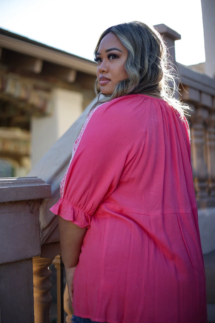 This embroidered 3/4 sleeve has us completely enchanted with it’s beauty. made from an amazing crinkle rayon, this woven blouse features a v-neck with tie option, 3/4 raglan sleeves with stunning embroidery and a ruffle trim, empire waist and rounded hem.