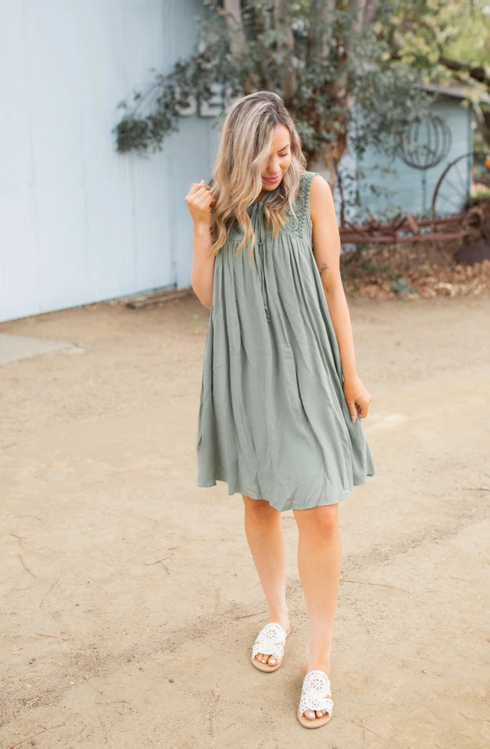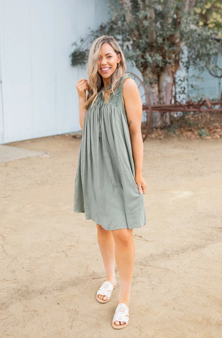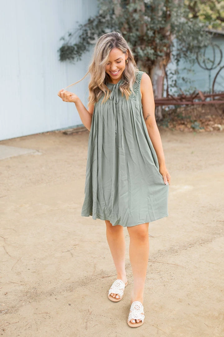 Escape from the everyday norm in this stunning crochet lace trimmed dress. With a relaxed fit, this dress features crochet lace trimmed sleeves and a round neckline with front self tie to create a keyhole front.Β
