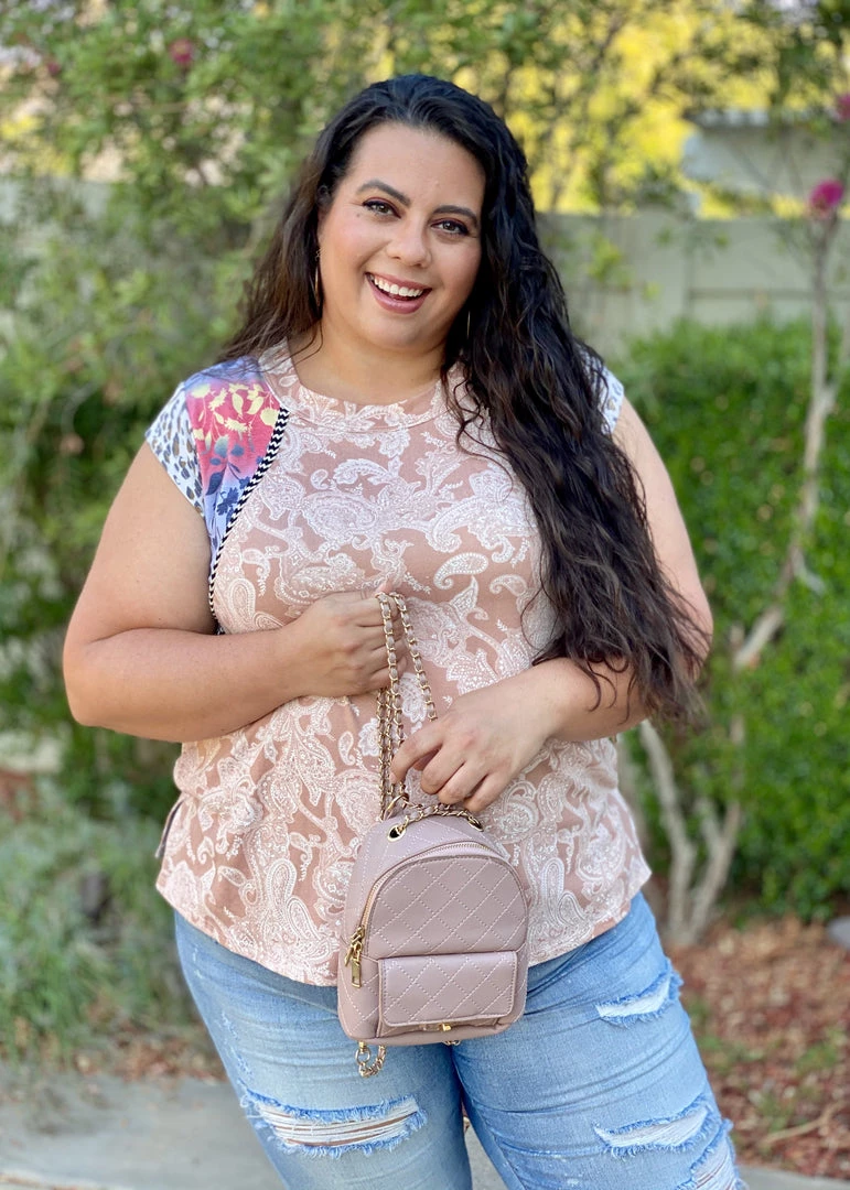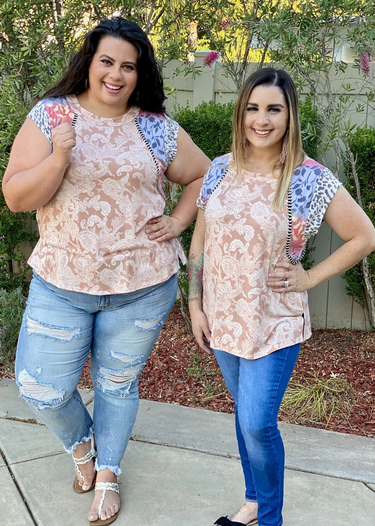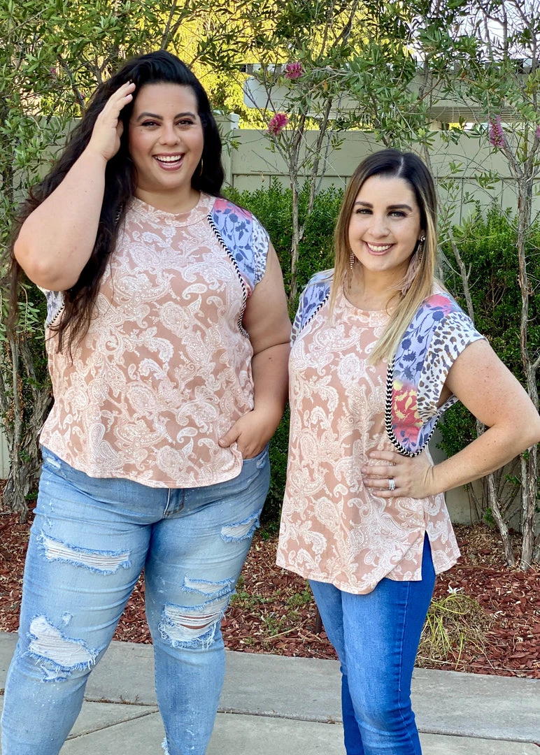 We are loving the pattern mixing in this short sleeve top. Everything flows so cohesively and will pair well with just about anything since it is tunic length.Β Featuring a round neckline, side slits and armhole trim detail, this will truly bring some uniqueness to your wardrobe.Β