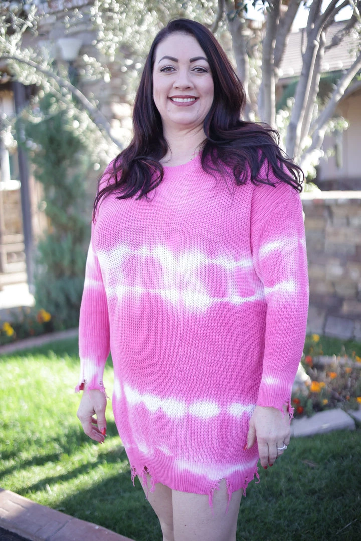 You can just feel the love radiating off of this hot pink, tie dyed sweater dress. Best part…you can also throw on some leggings and wear this as a tunic! With a straight cut, this dress features a round neckline, long sleeves and distressed hem details. Β Β