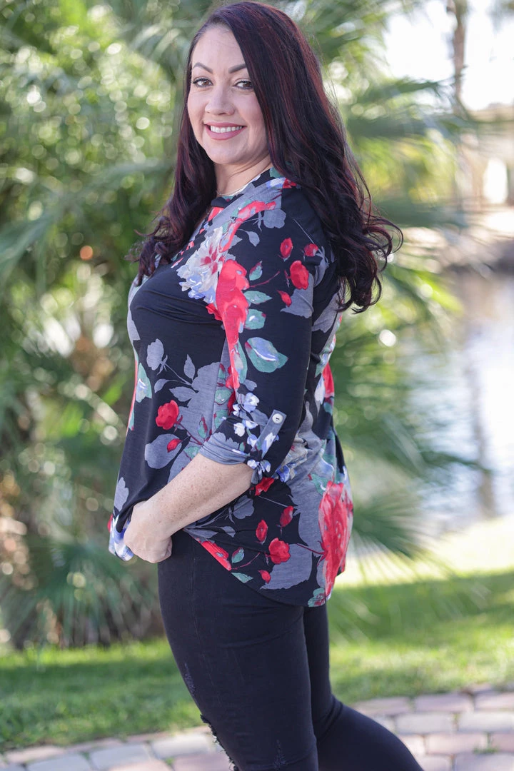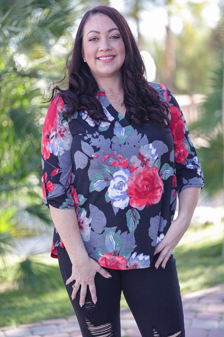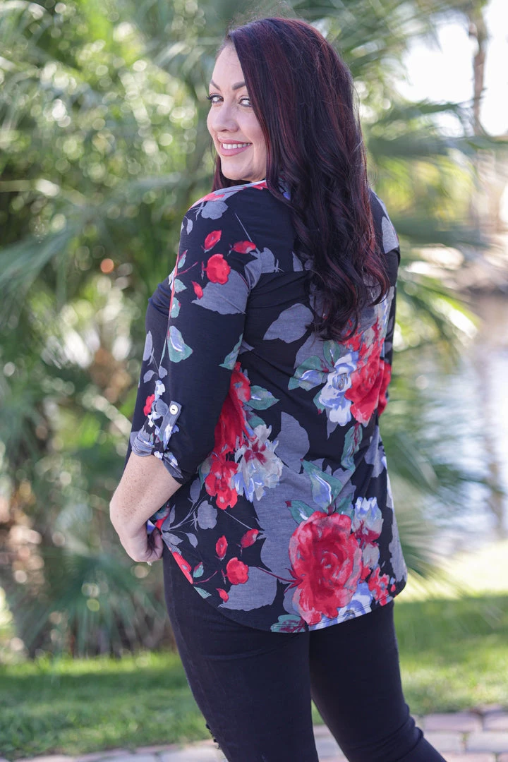 SearchingΒ for the perfect lightweight tunic? Look no further. The floral print on this GabbyΒ is an absolute treasure! Featuring a banded collar, v-neck and buttoned 3/4 sleeves, this top will make gettingΒ dressed seem effortless.