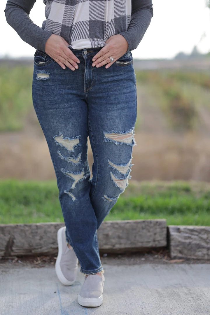 These amazing mid rise Judy blues not only have the classic Judy blue stretch, but they are oh so comfortable. With distressing throughout, this pair also has a frayed hem.