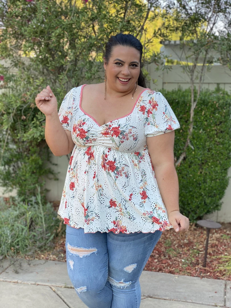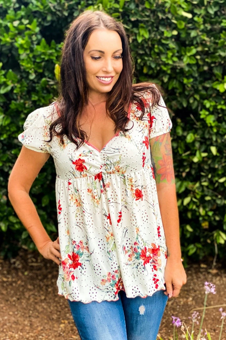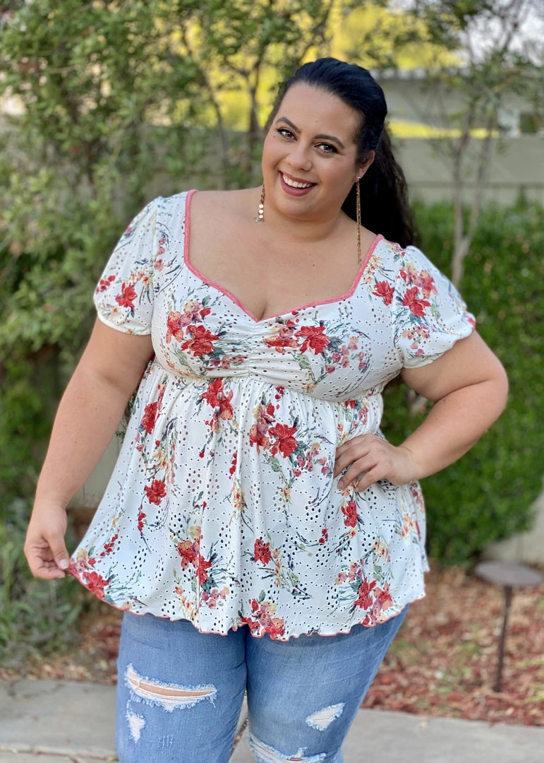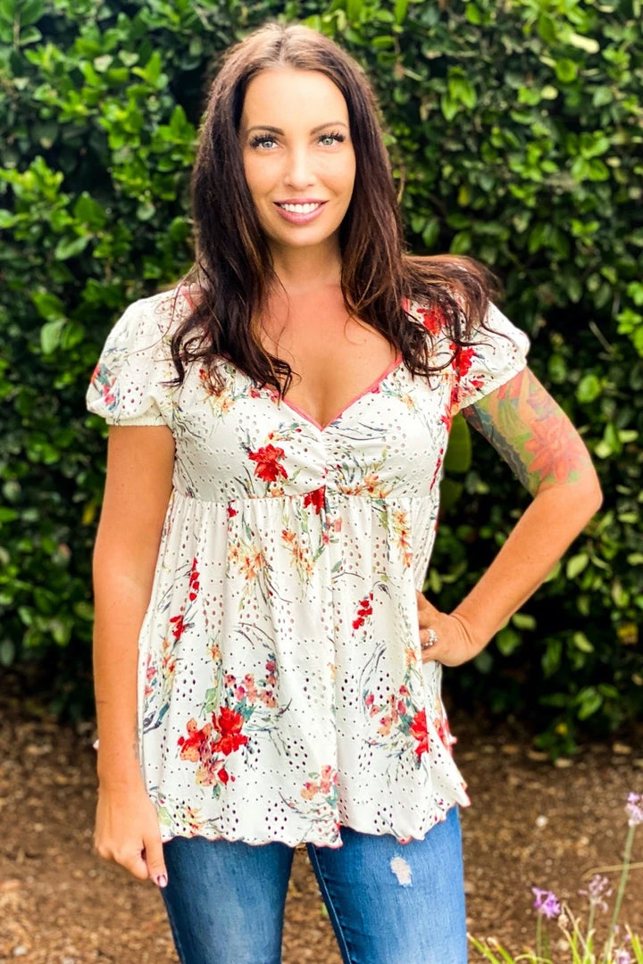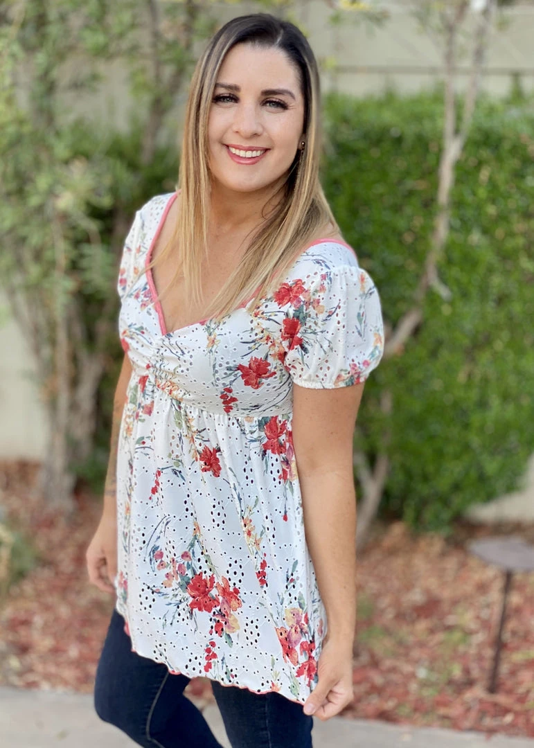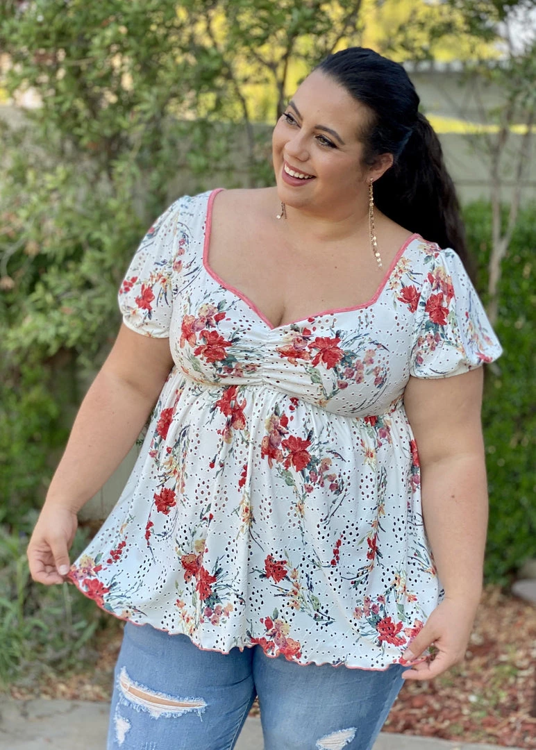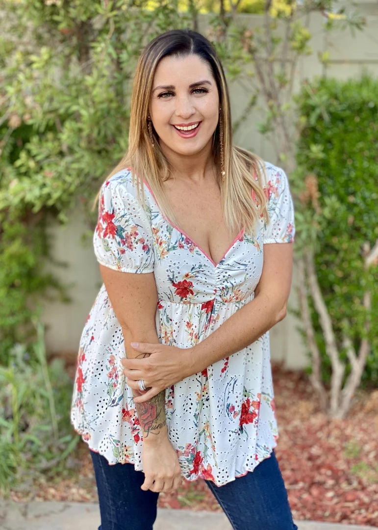 This babydoll top is unlike any babydoll that you’ll ever own. Not only does it make us feel like we are frolicking in a gorgeous wide open field, but the details are amazing. We especially love the unique v-neckline and ruched detailing on an eyelet backdrop, which is just the tip of the iceberg with the details. This top also features short sleeves, shirred pleated bodice detail and a marrow bottom detail.