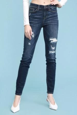 Your wardrobe goals are complete with these amazing skinny jeans from Judy Blue! These are aย great stretchy denim with a medium rise, and curve flattering skinny fit.The fuse patches give this destroyed look some added flare.ย