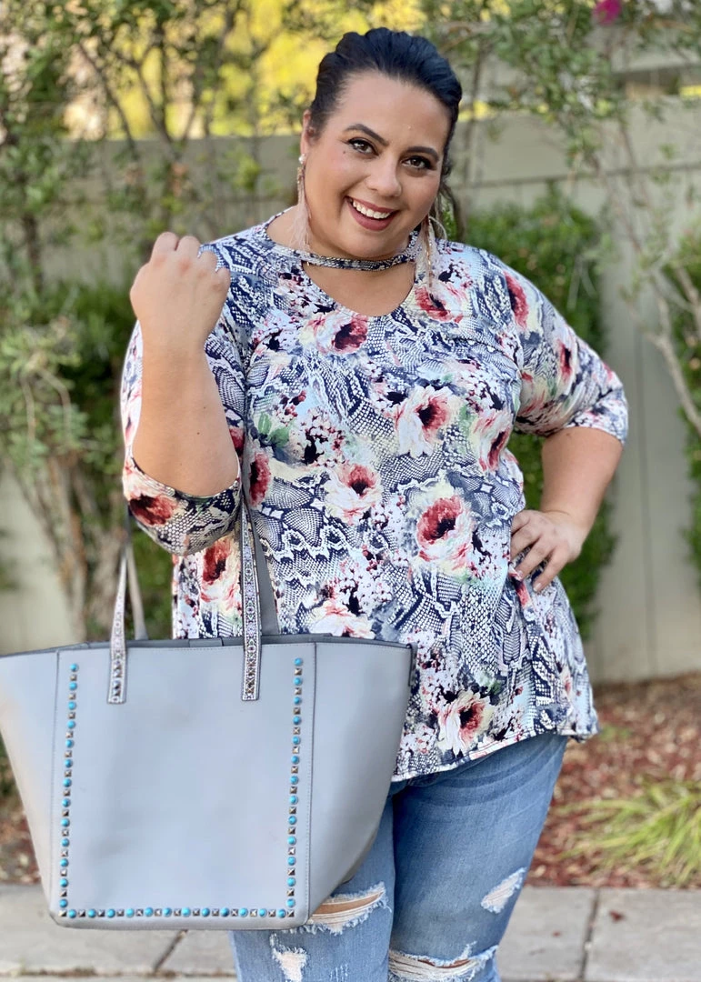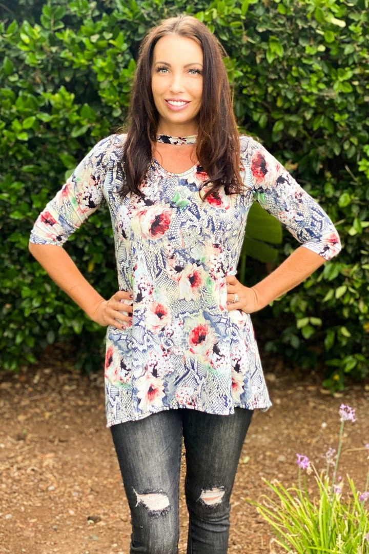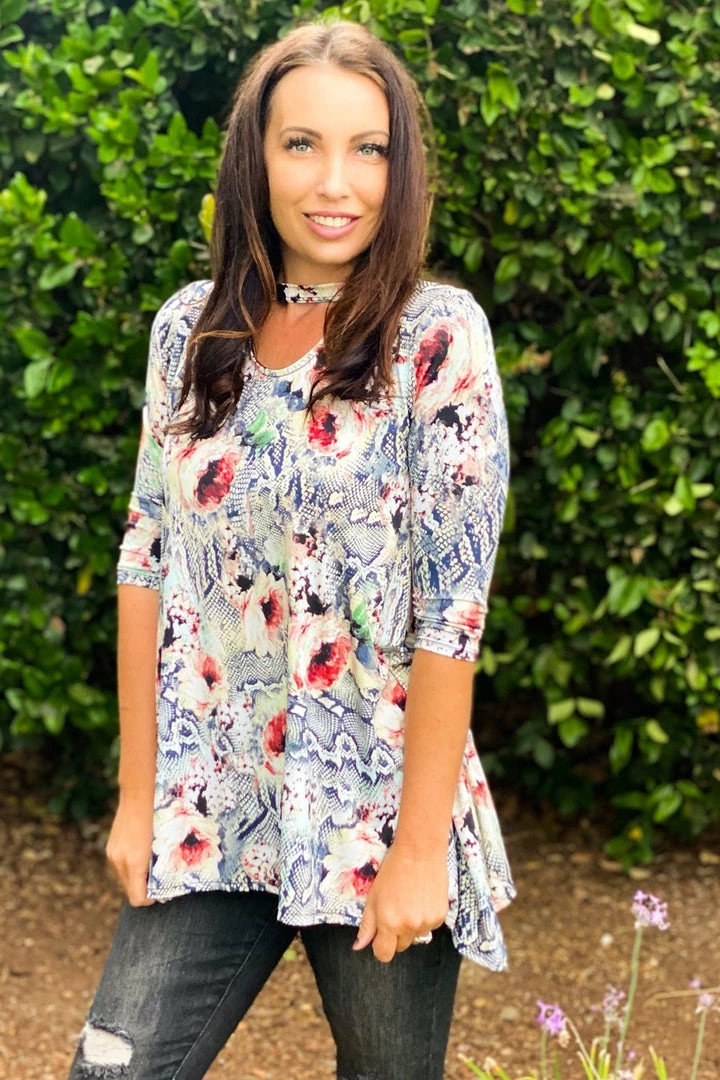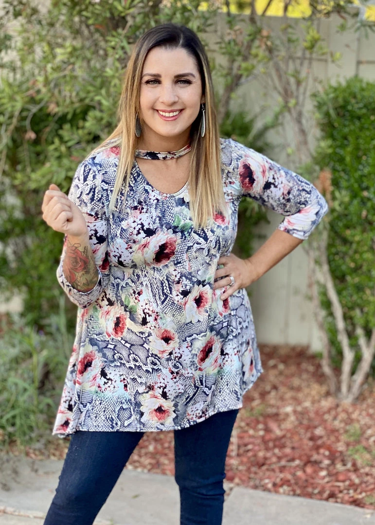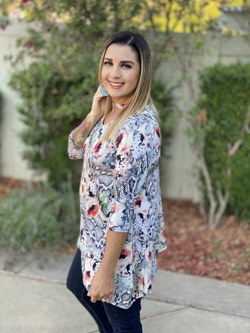 How amazing is this ΒΎ sleeve choker top? We are absolutely in love with the floral/snakeskin print on this silky soft top. Featuring ΒΎ sleeves, a relaxed fit and a front AND back keyhole detail, this top is going to carry your right into the next season.