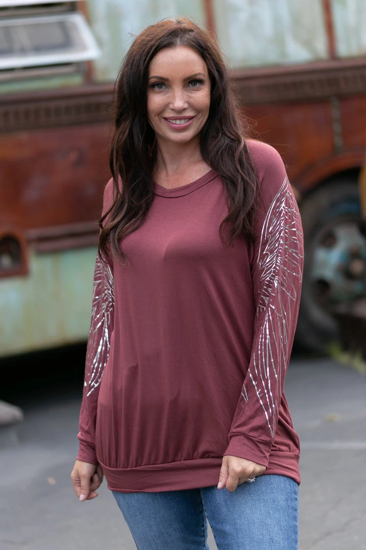 Wear your angel wings for all to see, in this oh so comfortable pullover. Made from the softest jersey fabric, this top features a relaxed fit, boat neckline and banded hem.
