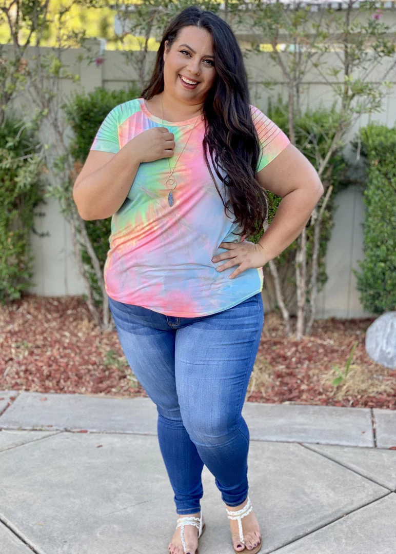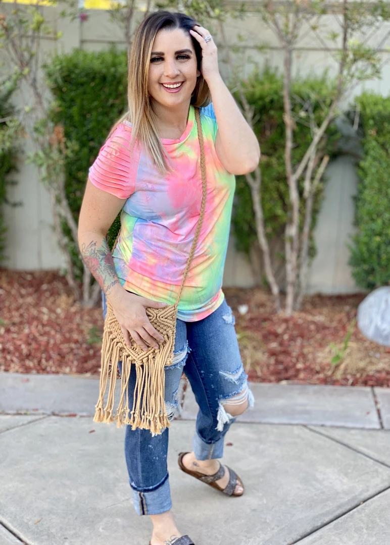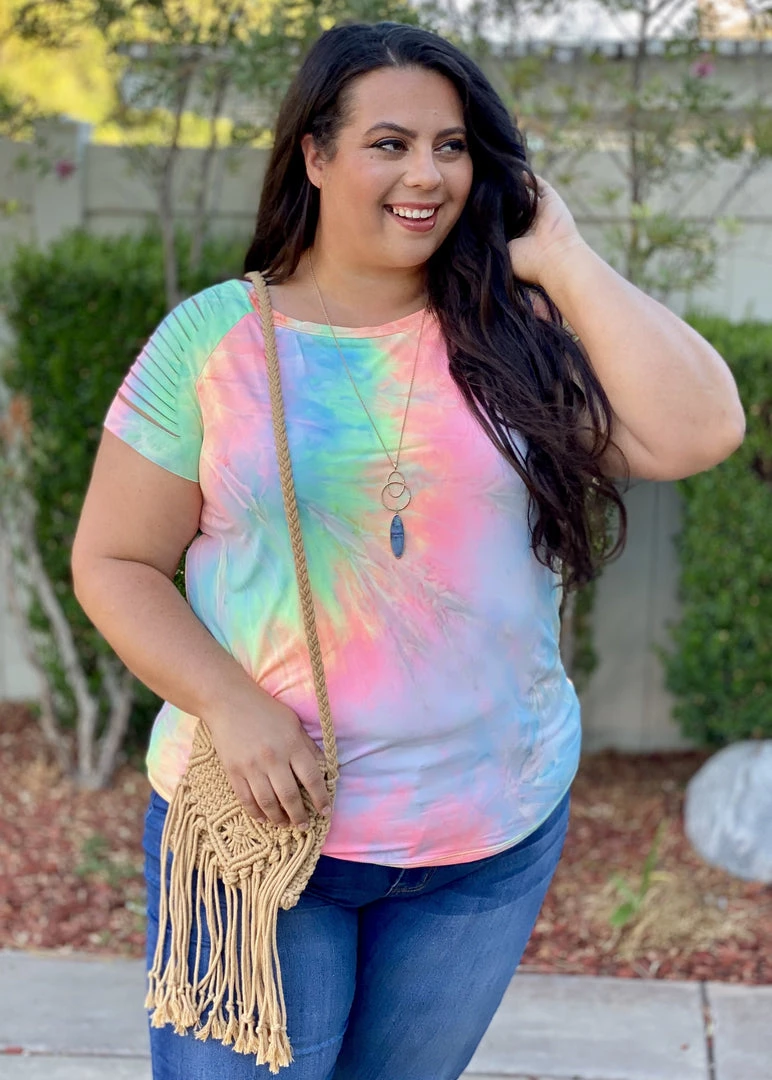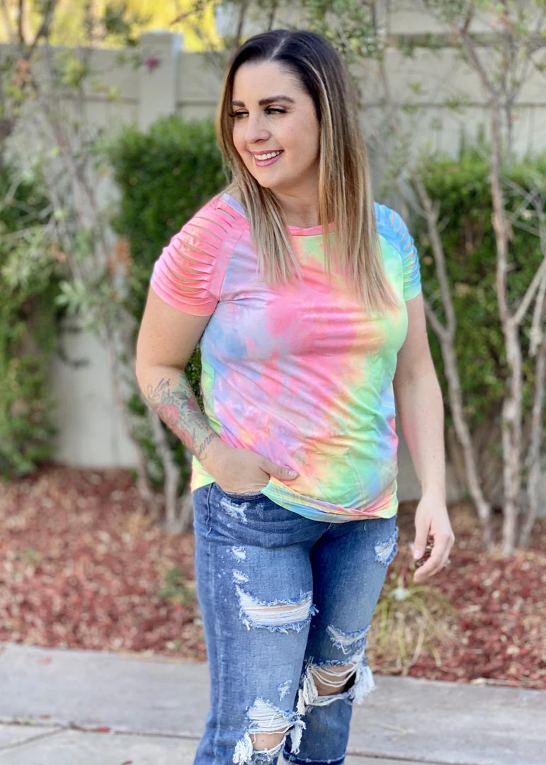 This gorgeous tie dye laser cut out top makes us feel like we areΒ floating in the clouds with happiness. Featuring short sleeves with laser cutout details, a round neckline and relaxed fit, this top brings a little edge to a classy everyday top.Β Β