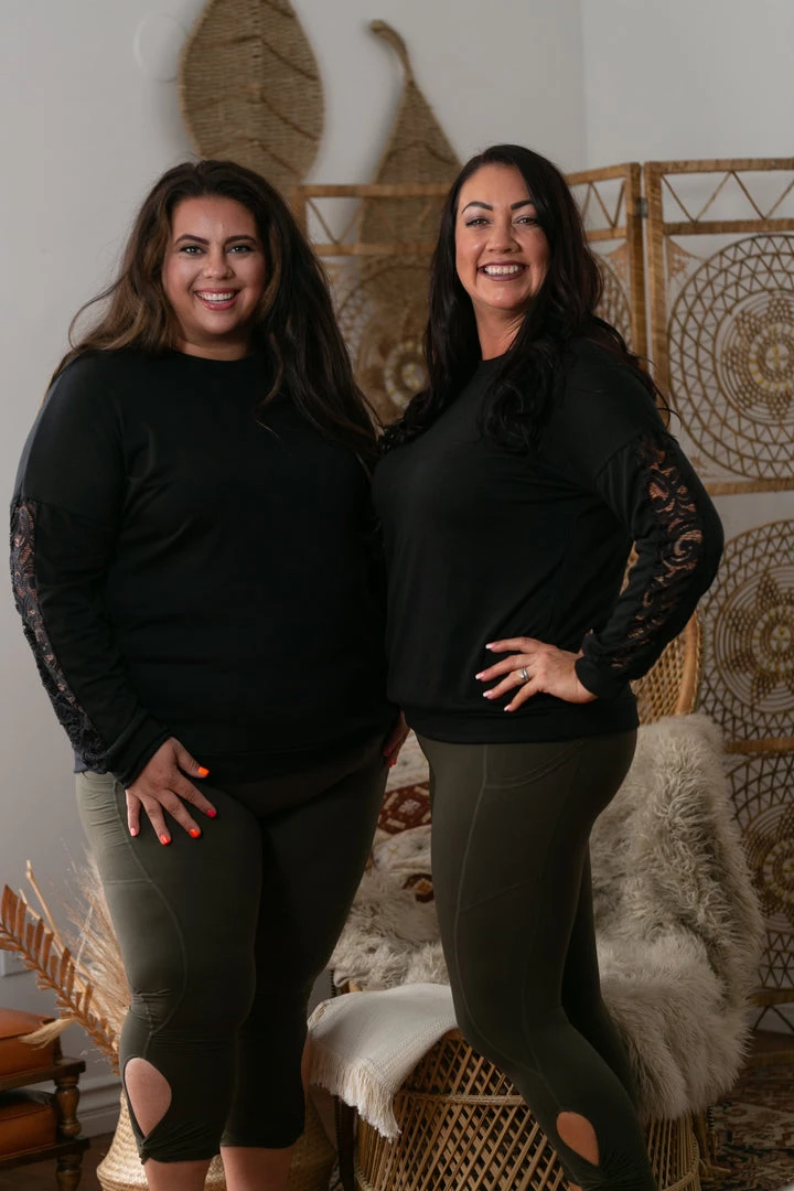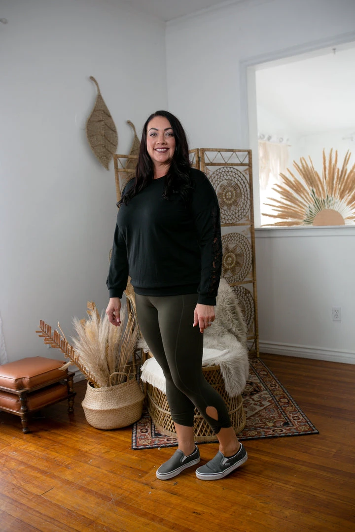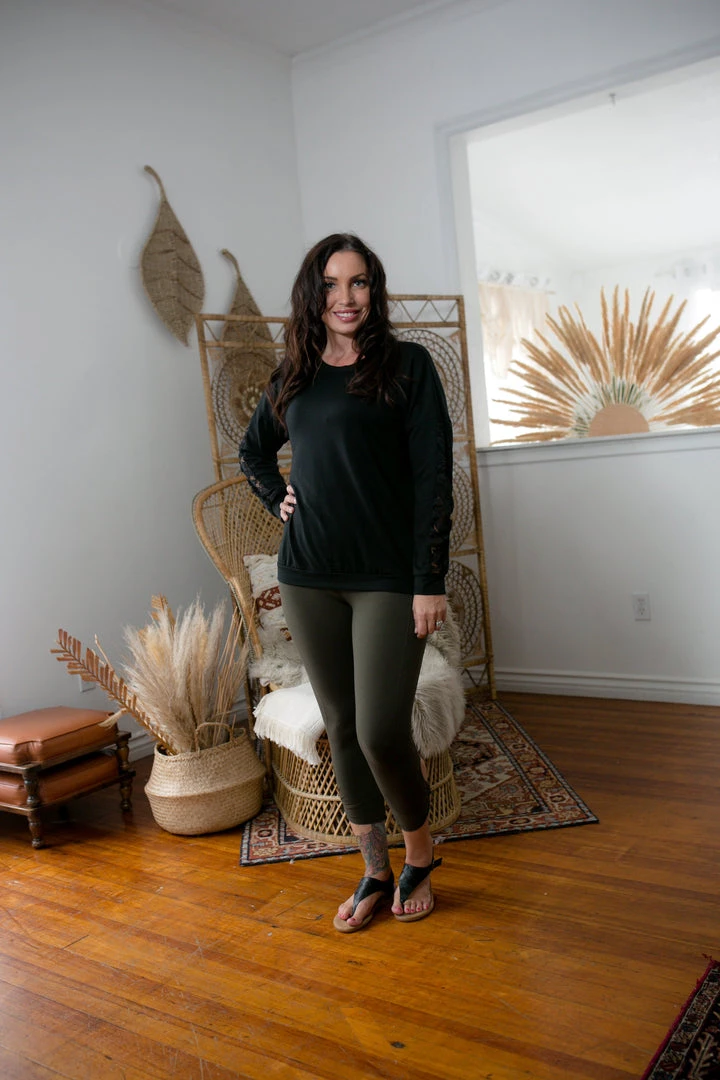 We love the lace accents on this staple black pullover, giving it just the right amount of edge. With a relaxed fit, this top features a round neckline, long sleeves and banded hem.Β Β