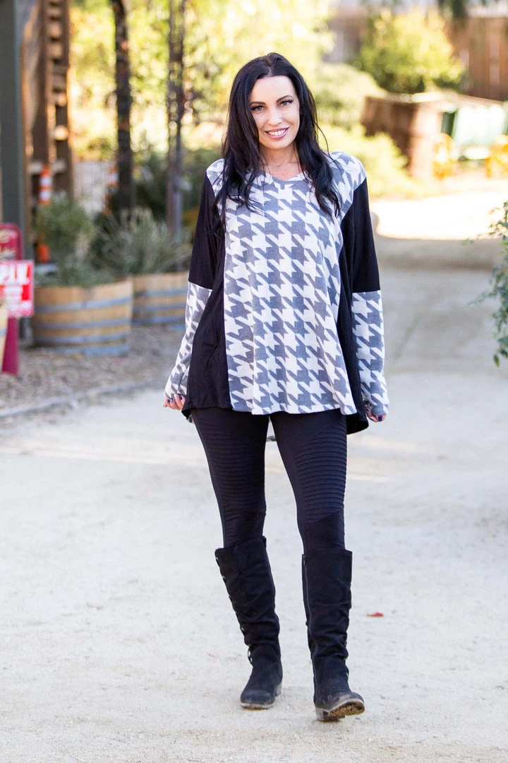 Soft and classy, this long sleeve top is all that and then some. Made from super soft brushed hacci this top features a v-neck, color blocked sleeves and black side detailing.Β Β Β