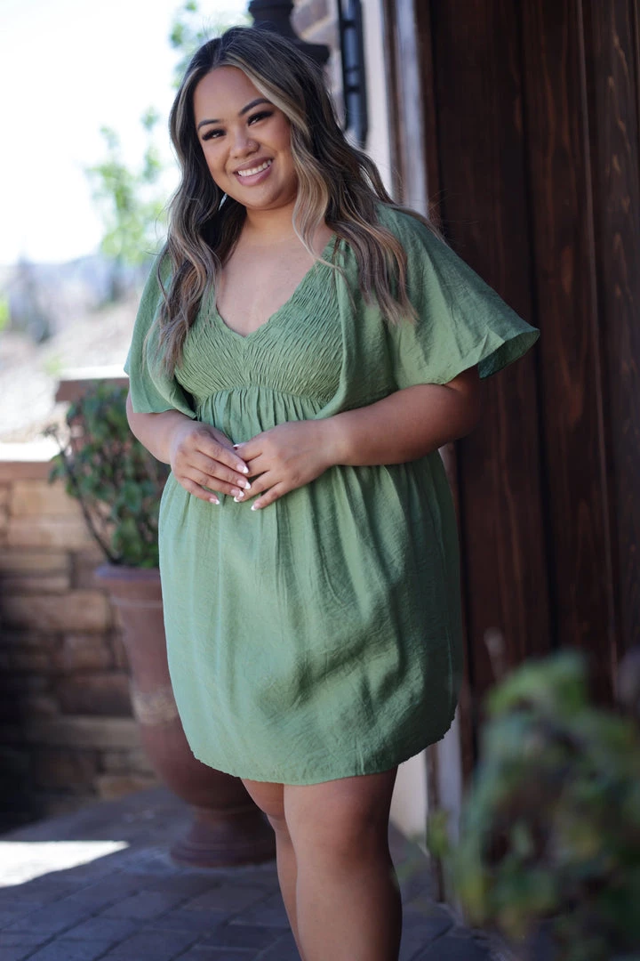 We are absolutey swooning over this olive dress. It is perfect for any occasion and it looks amazing on all body types. Made from the most amazing, lightweight fabric, this dress features a smocked v-neck, short flutter sleeves and rounded hem.Β Β Β Β
