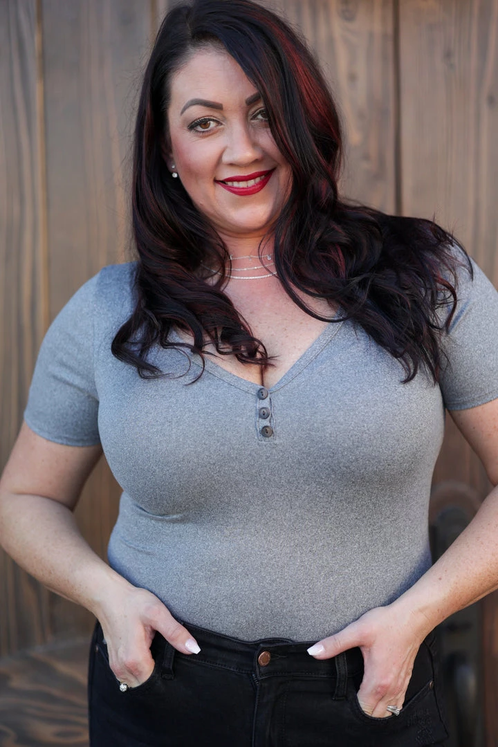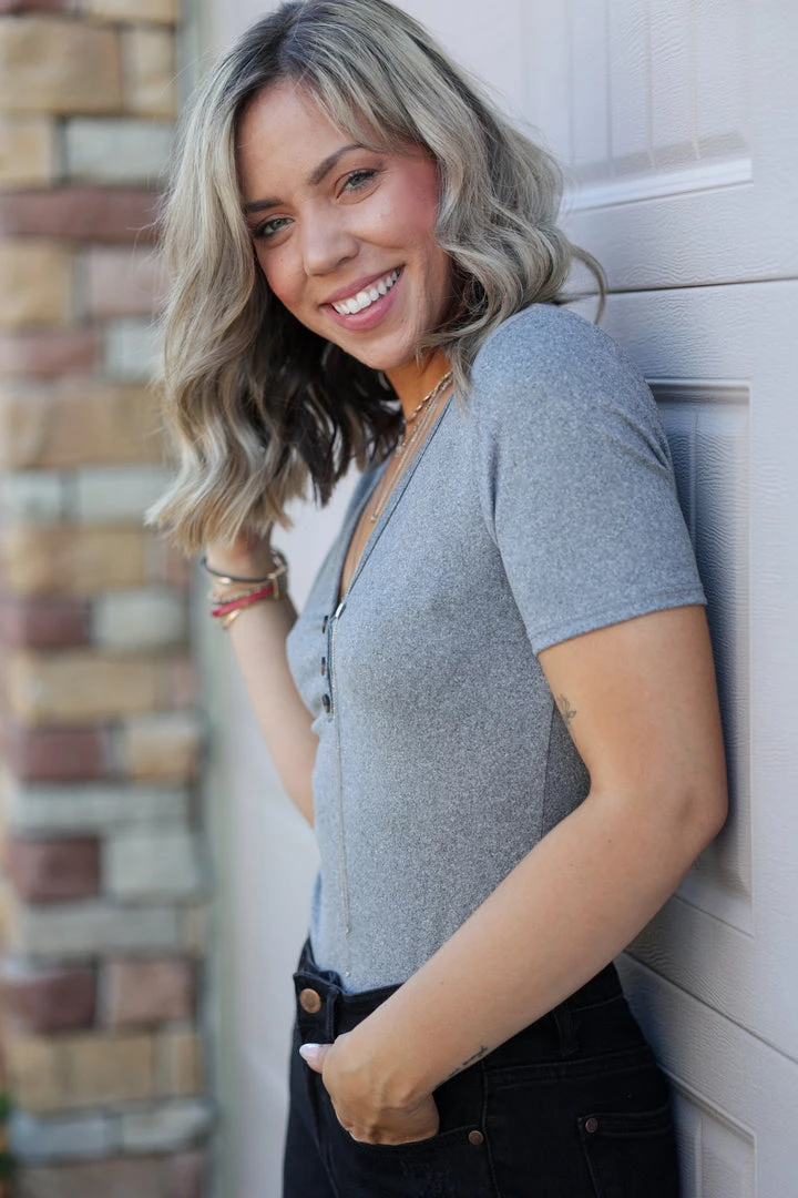 Have you been searching for the perfect top to layer under your cardigans without feeling too frumpy? Well look no further! This heather grey bodysuit will pair so well with everything and features a button snap (for easy in and out), short sleeves and v-neck with button down details.