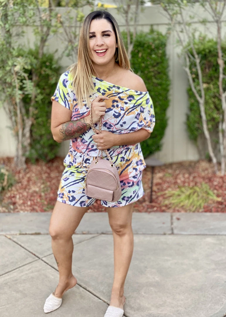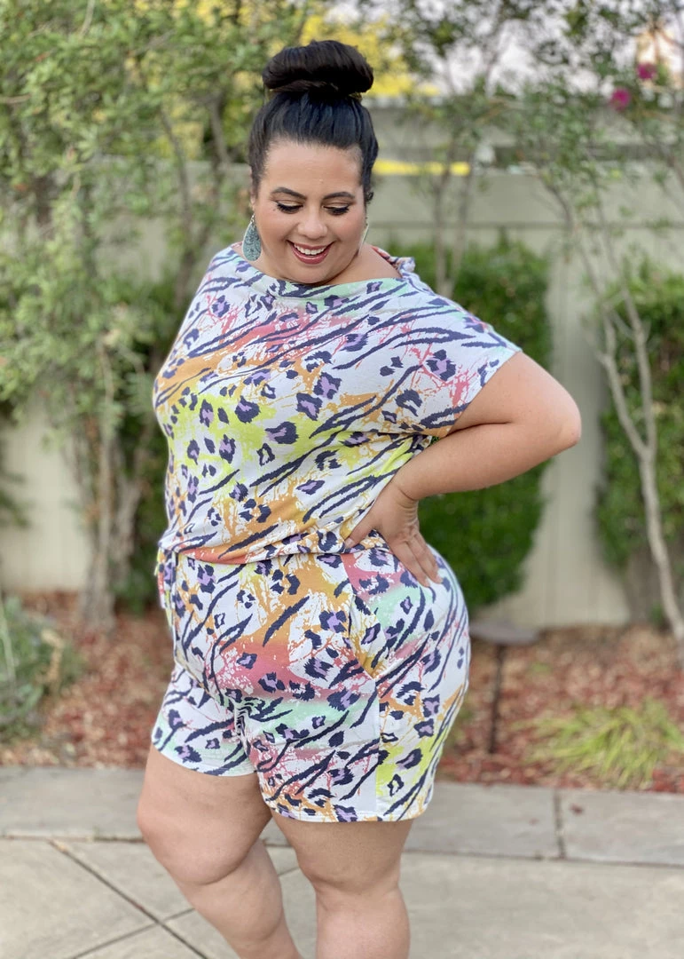 We are loving everything about this amazing multi-colored leopard printed romper, especially the fact that it reminds us of Lisa Frank. Made from a soft and stretchy french terry, this romper can be worn off the shoulder or on for a wide boat neck look. Featuring short sleeves, an elastic waistband with adjustable drawstrings.Β