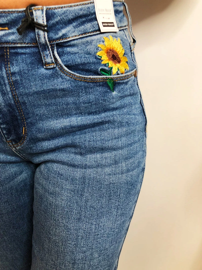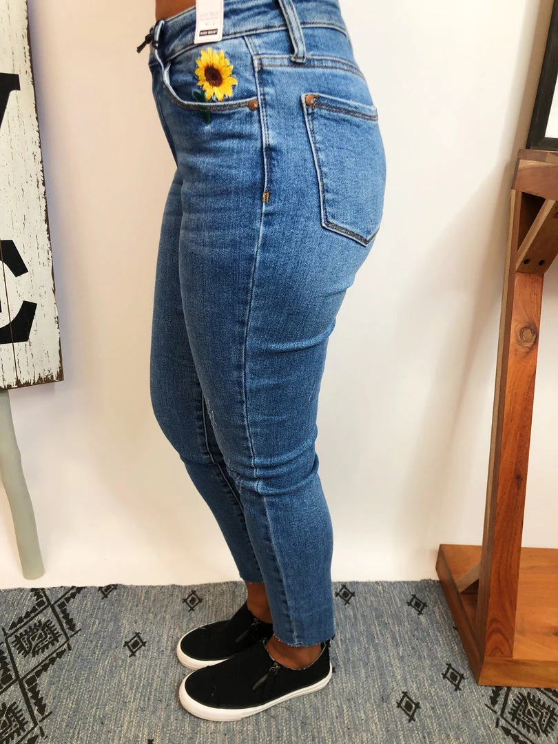 Judy blue has outdone themselves with this PERFECT pair of relaxed jeans. That sunflower embroidery is to die for and great for those warmer days, or just when you want to dream about those warm days. True to size, Iris wears 18WΒ