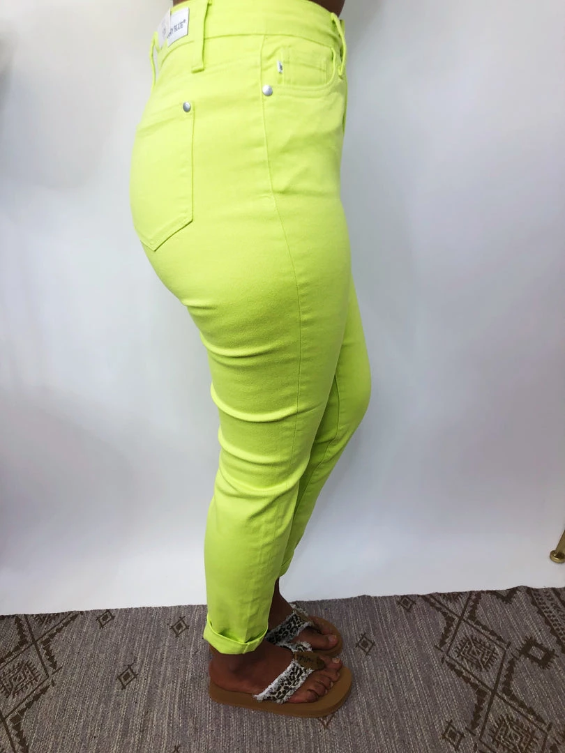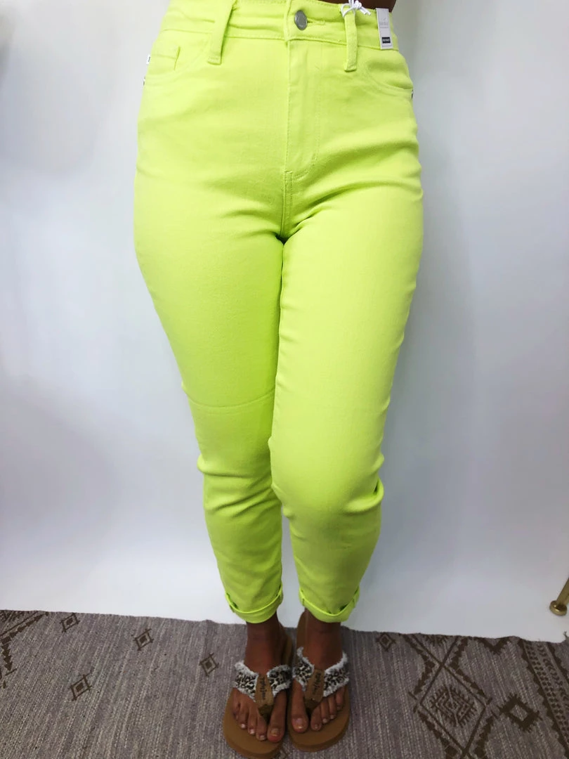 These lime green cuffed slim fit Judy Blue Jeans are AMAZING!!! They have a beautiful lime colorway!Β I bet you don’t have any jeans as beautiful as these ones, girl! These beauties add a lot of style and personality to any outfit! You’re gonna love them!!!