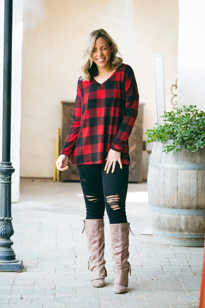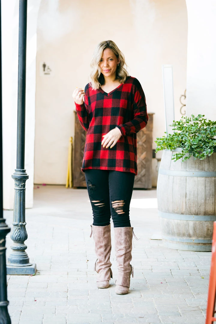 We are mad about plaid, and this deep v-neck pullover takes the cake. Featuring long sleeves,Β and a rounded hi-lo hem, this pullover looks amazing on all body types.