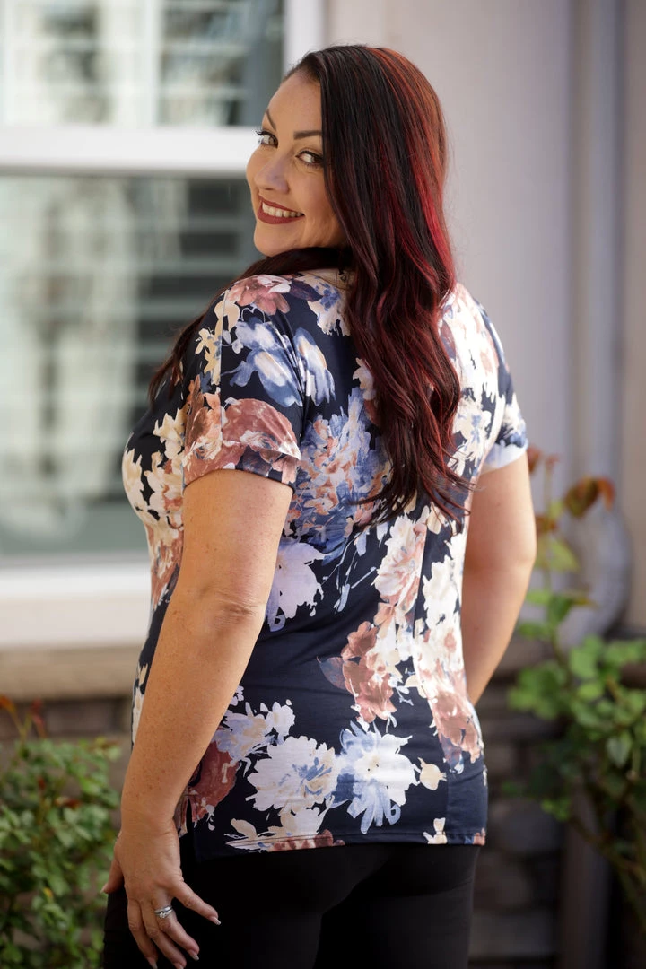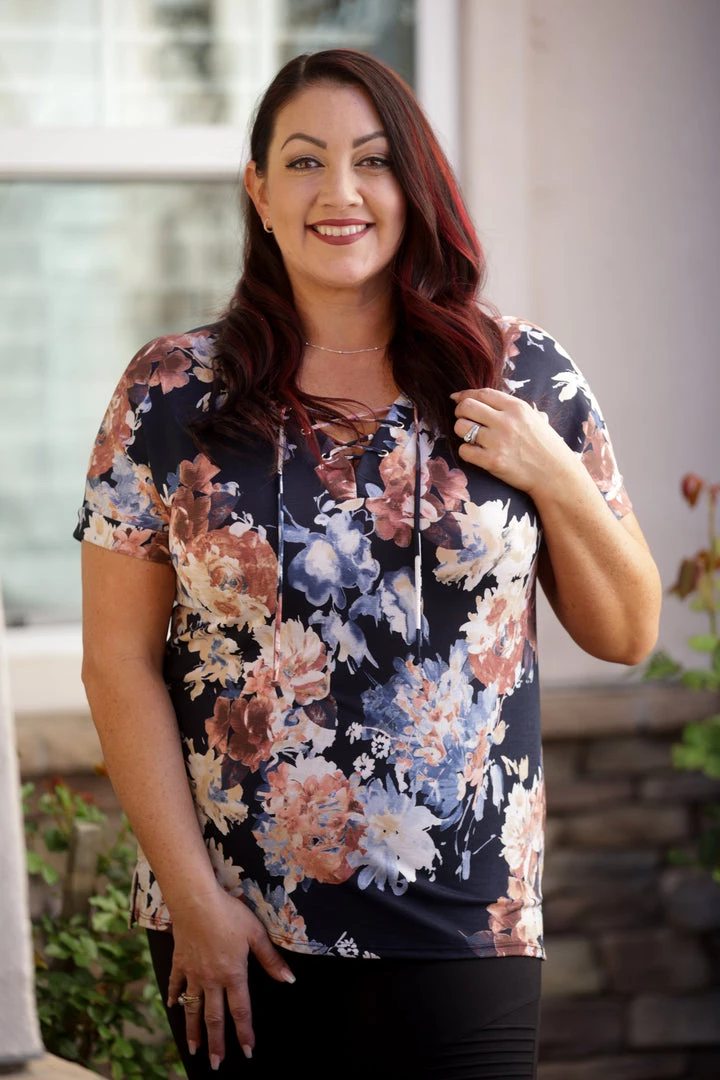 This light weight short sleeve top is the perfect shades of navy’s and neutral tones…reminding us of a blooming midnight rose. Made from bulgari, this top features short sleeves, a relaxed fit and v-neck with tie details.