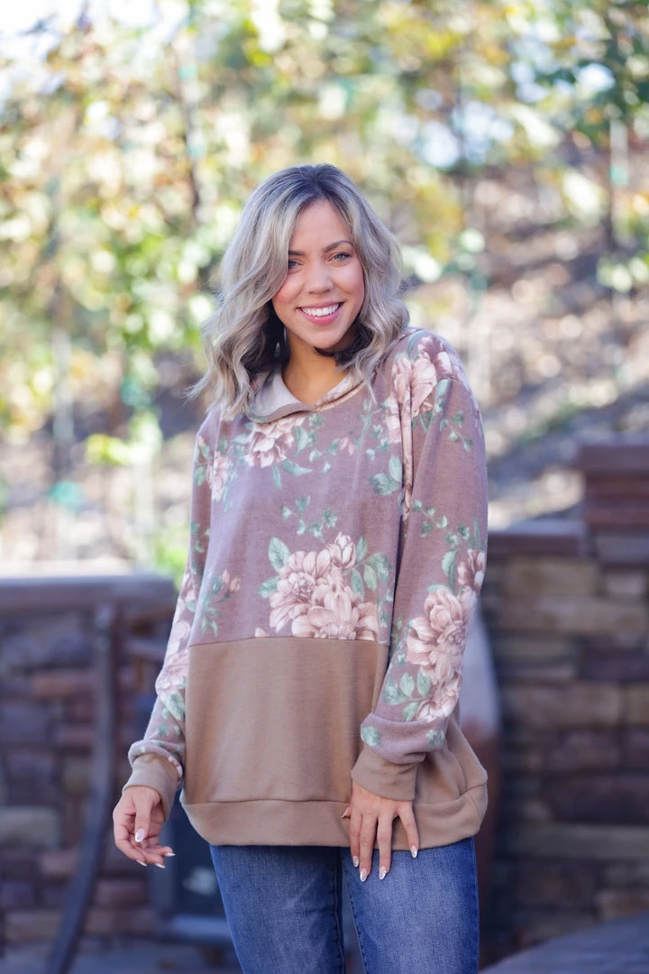 There’s just something so classy about a neutral tone piece, and this hoodie takes the cake. We are loving the floral color blocking! Made from the softest brushed material, this hoodie features long sleeves and side pockets.