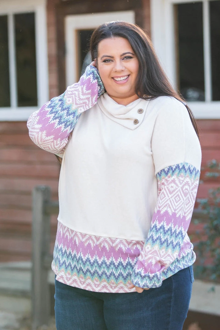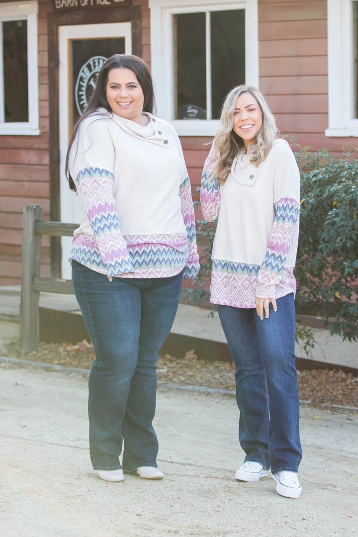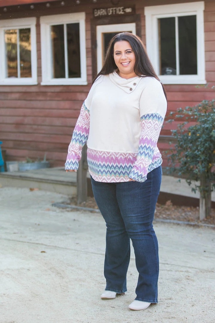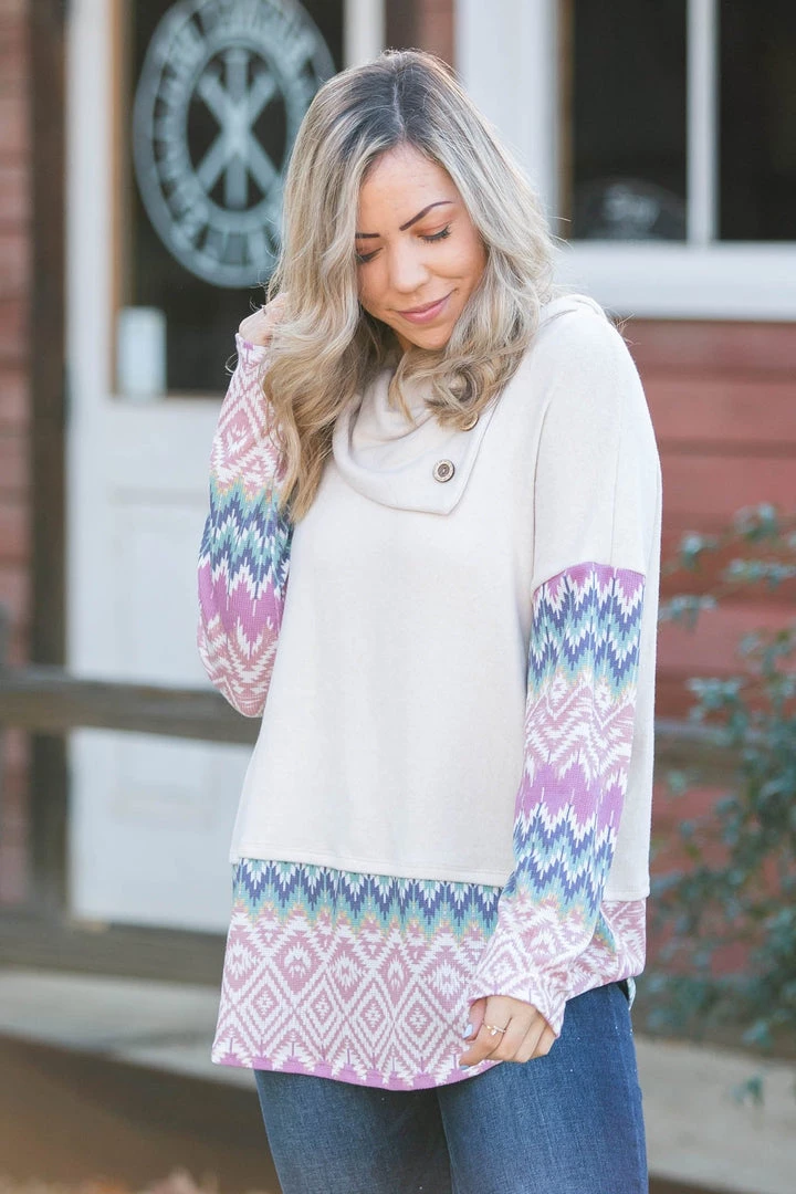 This gorgeous cowl neck has the most harmonious colors throughout. Made from the softest brushed fabric; which has a cashmere feel, this top features long sleeves, cowl neck with a button detail and a relaxed fit.Β