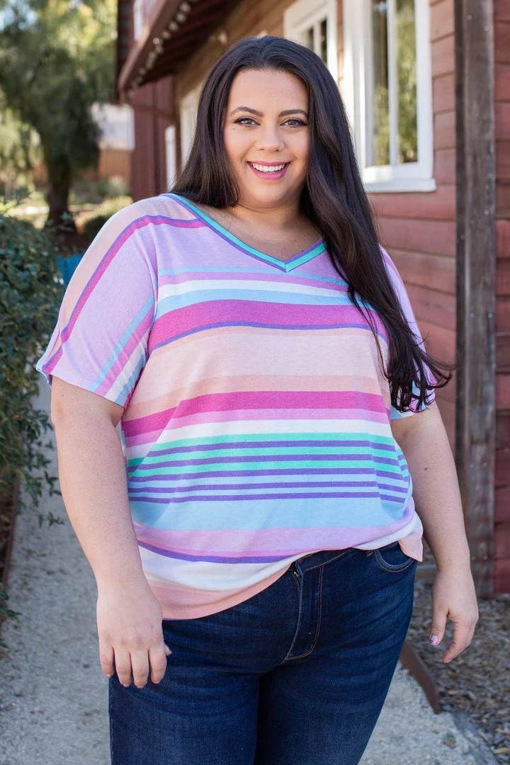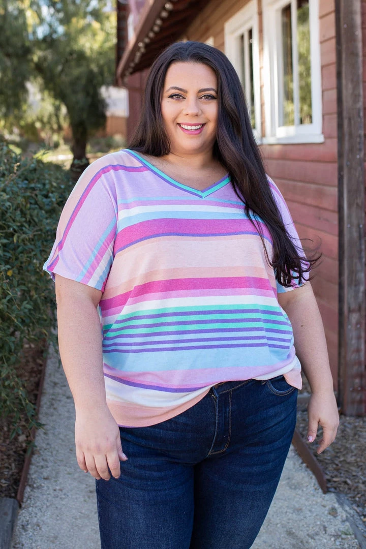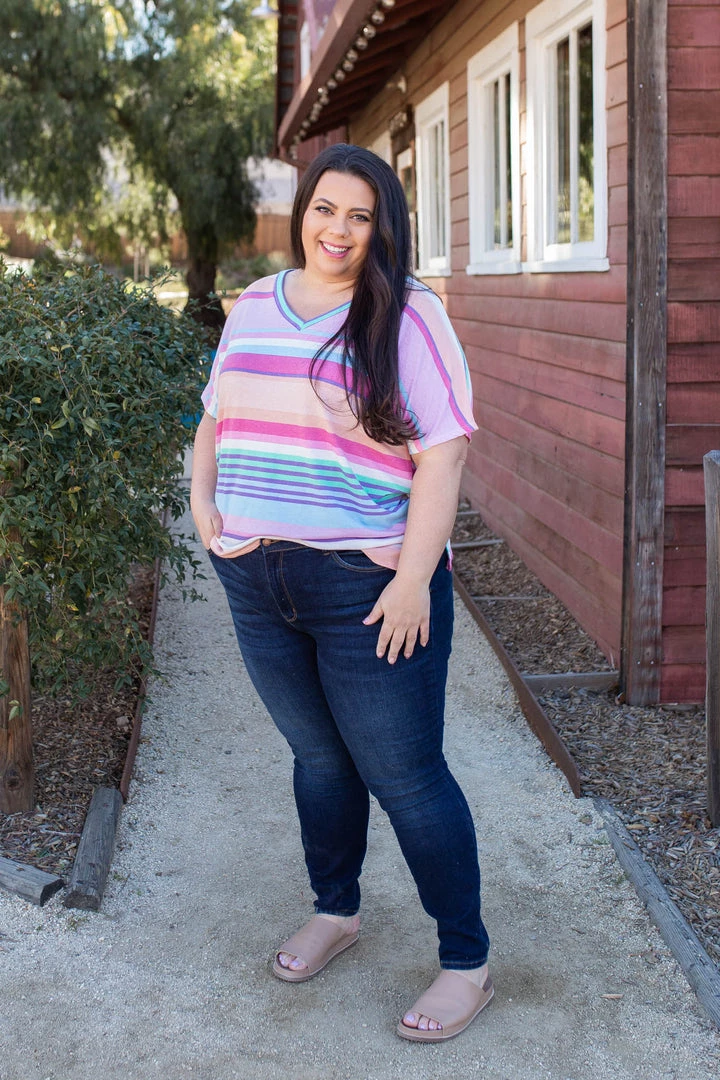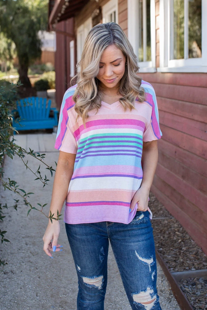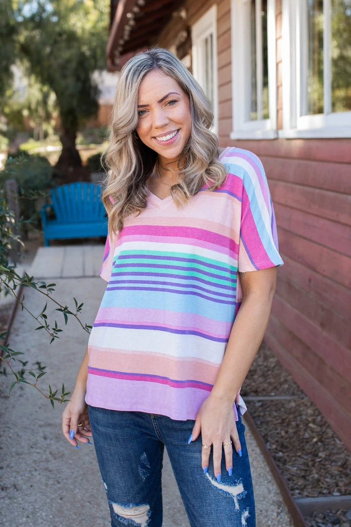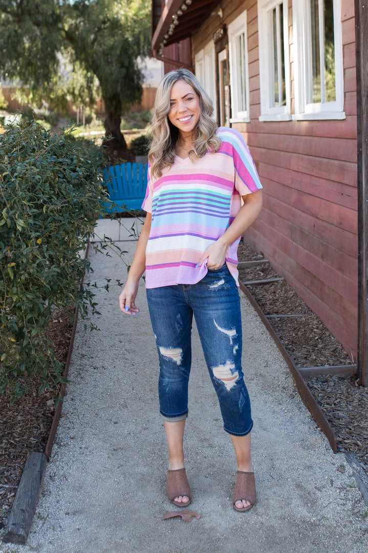 This top makes us want to be at the beach sipping on a peach daiquiri…virgin or non version. Either way you mix it, this top screams sunshine. Featuring a relaxed fit, short dolman sleeves and a v-neck, this top will pair well with just about anything.Β Β Β Β Β Β