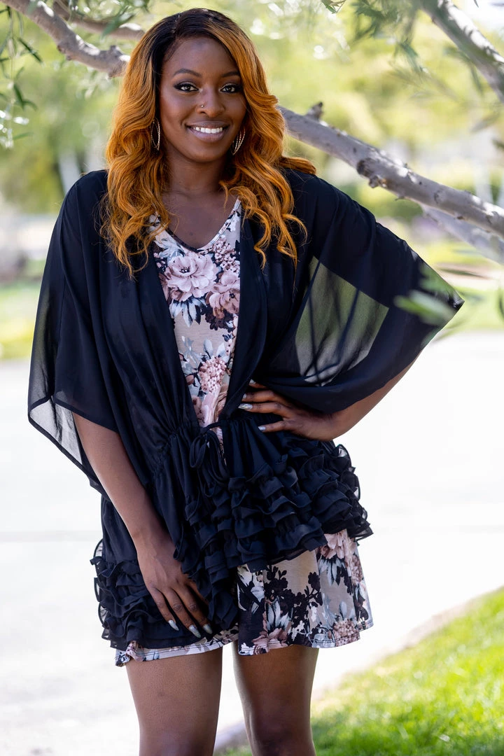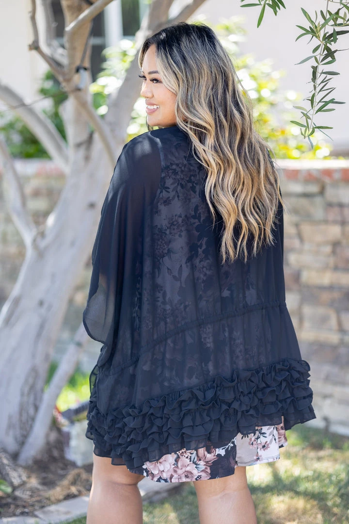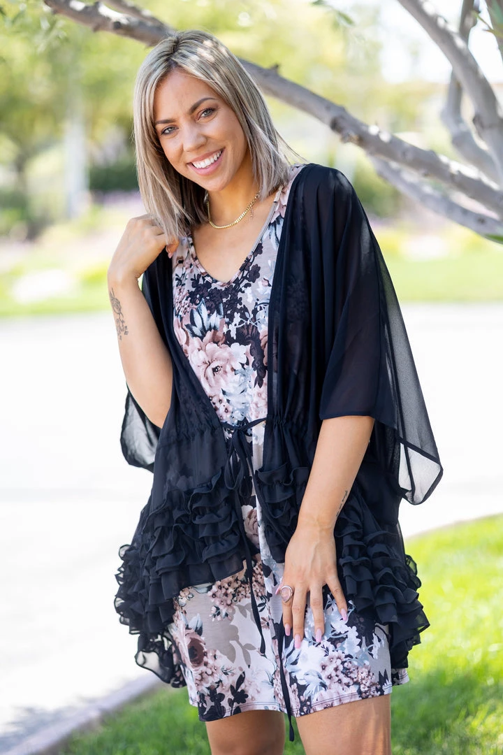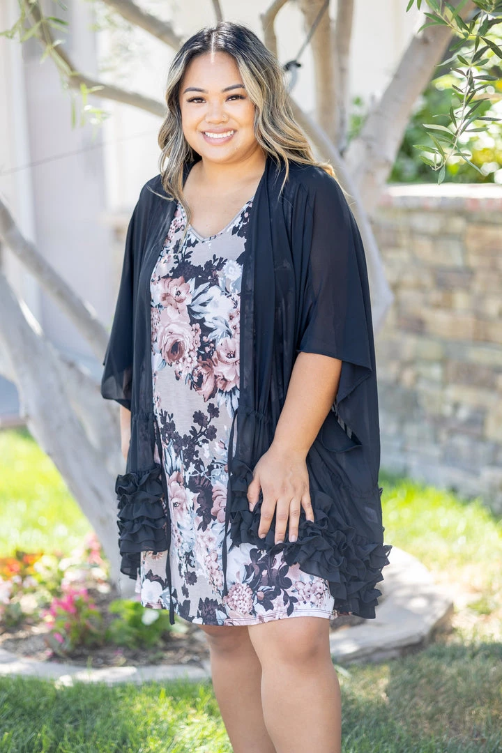 This lightweight kimono cardigan is the perfect layering piece for those warmer days. With an oversized fit, this piece is perfect to layer over just about anything. Featuring a ruffled hem, 3/4 sleeves and a tie enclosure.Β Β