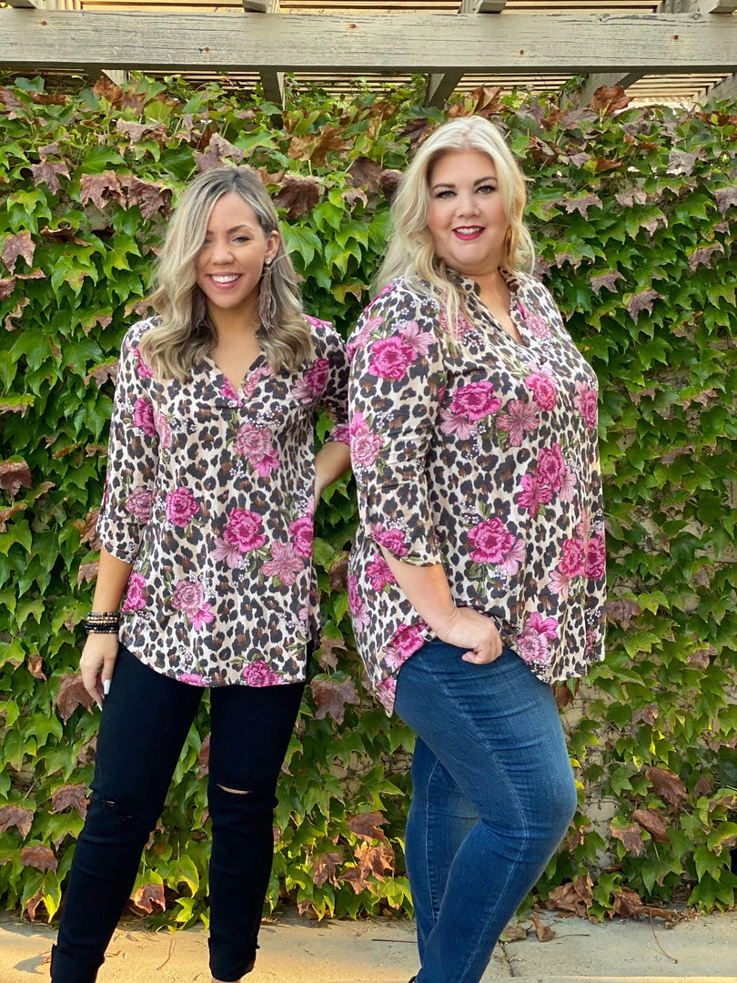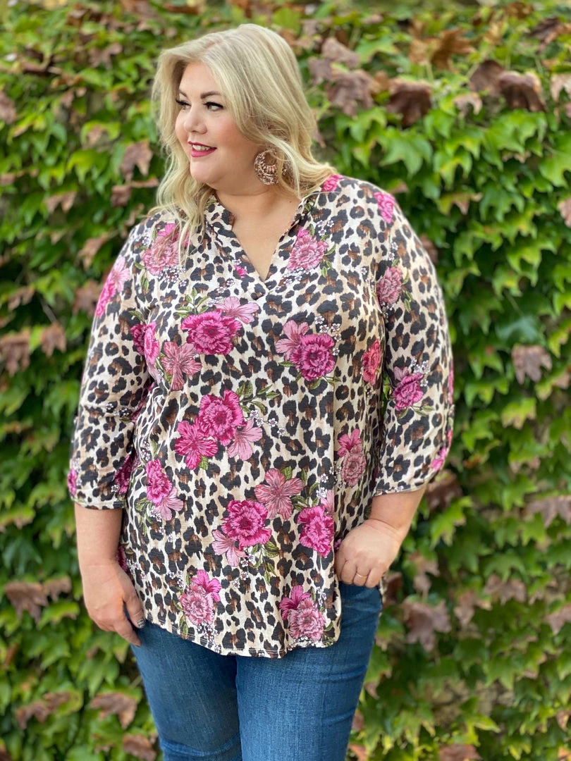 SearchingΒ for the perfect lightweight tunic? Look no further. The gorgeous animal and floral pattern on this Gabby makes us feel like we are getting ready for a dream vacation in Peru!Β Featuring a banded collar, v-neck and buttoned 3/4 sleeves, this top will make gettingΒ dressed seem effortless.Β Β Β Β