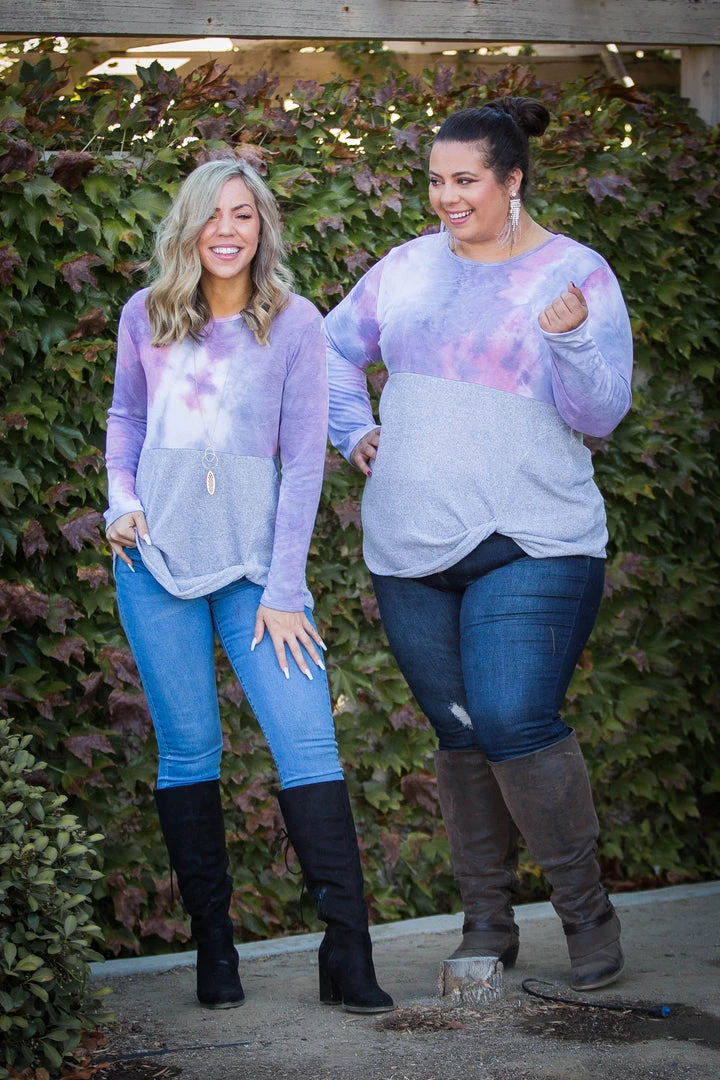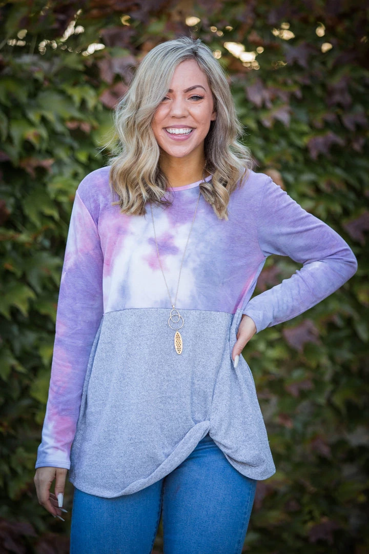 We are obsessed with this color block, front twist, long sleeve top. The two tone hacci underneath this pink and grey tie dye remind us of those gorgeous pink sunsets.Β