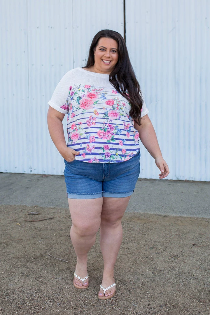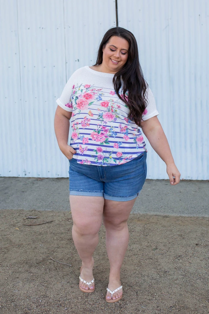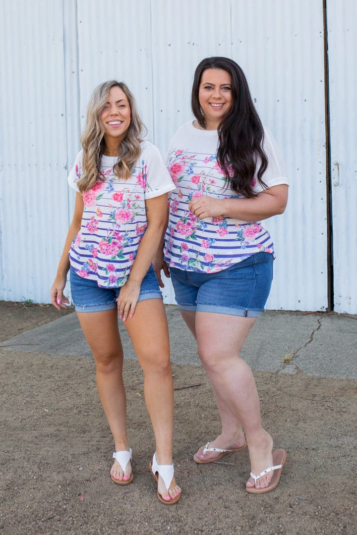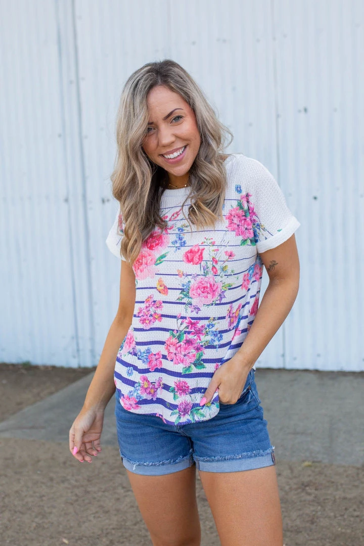 We are literally obsessed with this short sleeve sublimation printed top. The stripes, the flowers, the butterflies, the lightweight waffle knit, the fit…everything about it is perfection. With a relaxed fit, this top features a round neckline, short dolman sleeves and rounded hem.Β Β Β Β