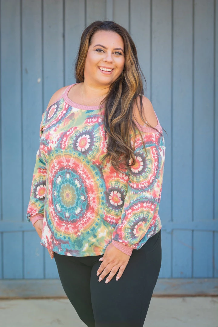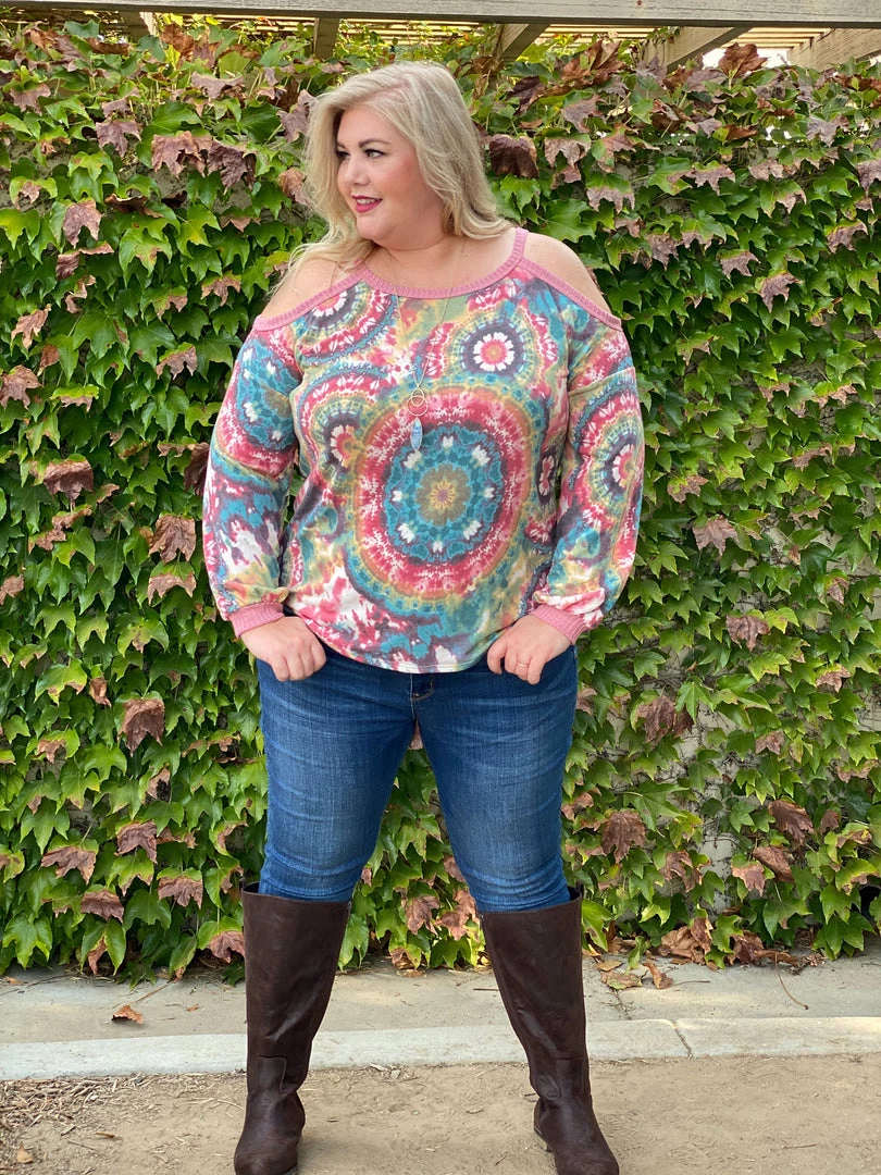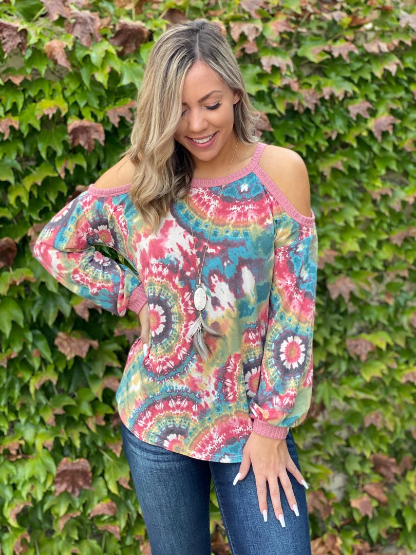 We are loving the prismatic vibes in this tie dye cold shoulder top. Featuring waffle knit lining, a relaxed fit and balloonΒ sleeves, this top will become your absoluteΒ favorite .Β Β
