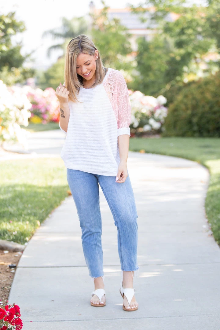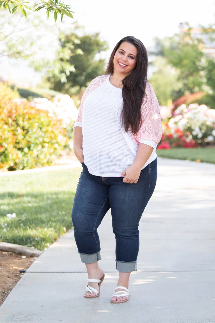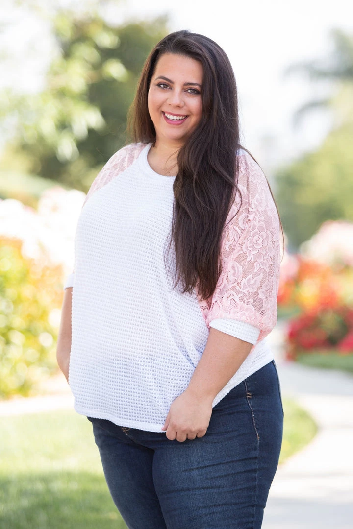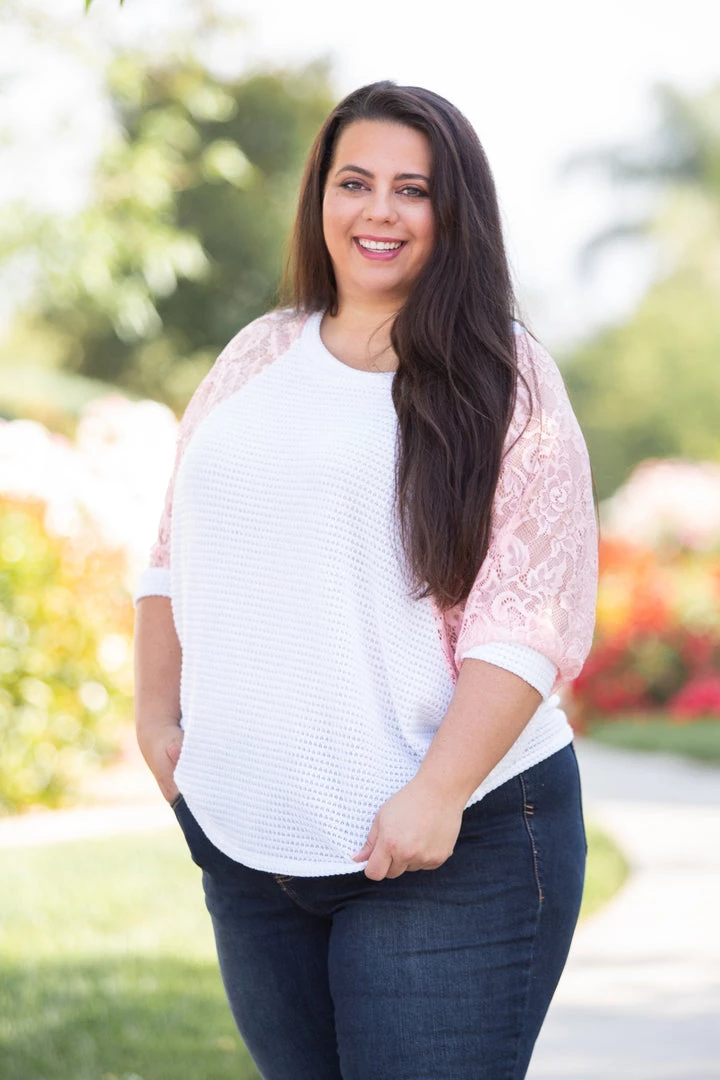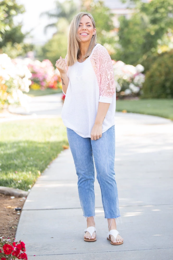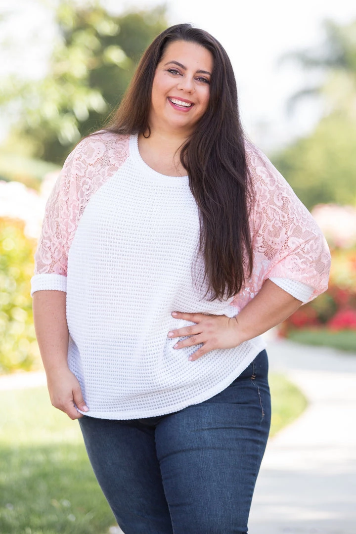 This top brings us an overwhelming feeling of delightfulness. The waffle knit bodice and those contrasting pink lace dolman sleeves is as perfect as it gets. With an oversized, slouchy fit, this top features a boat neck and 3/4 dolman sleeves.Β Β