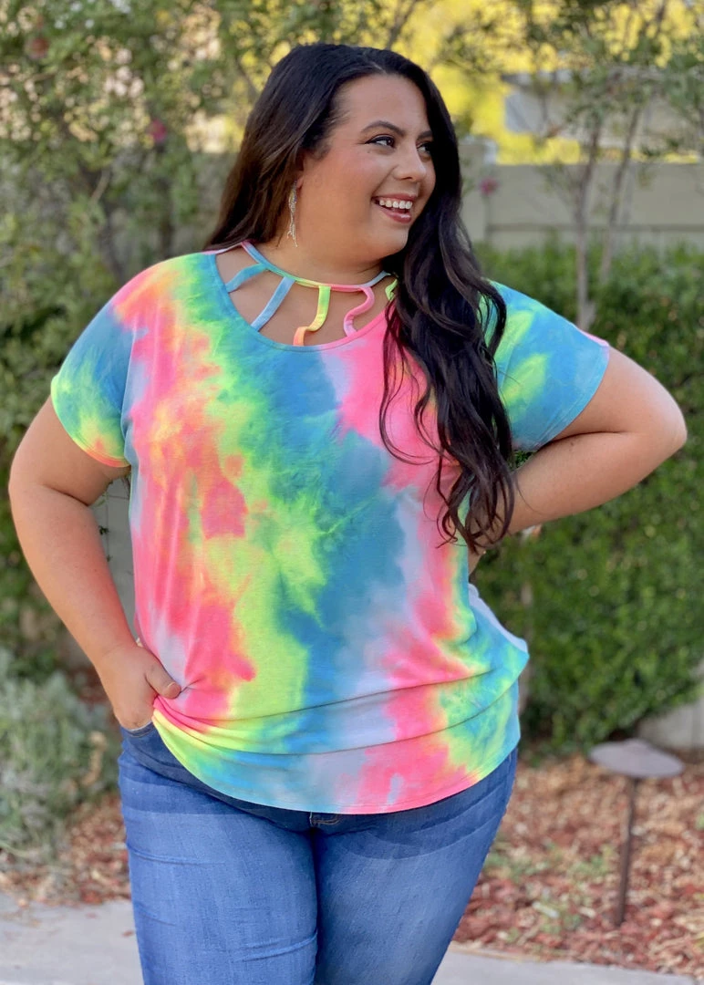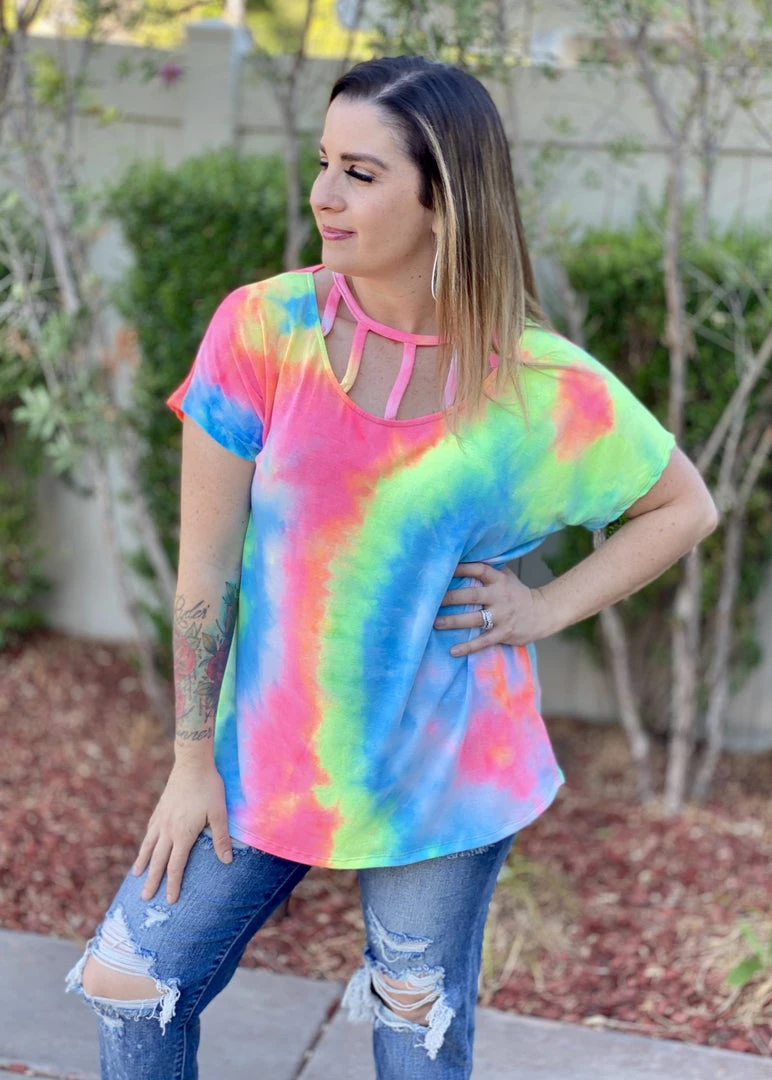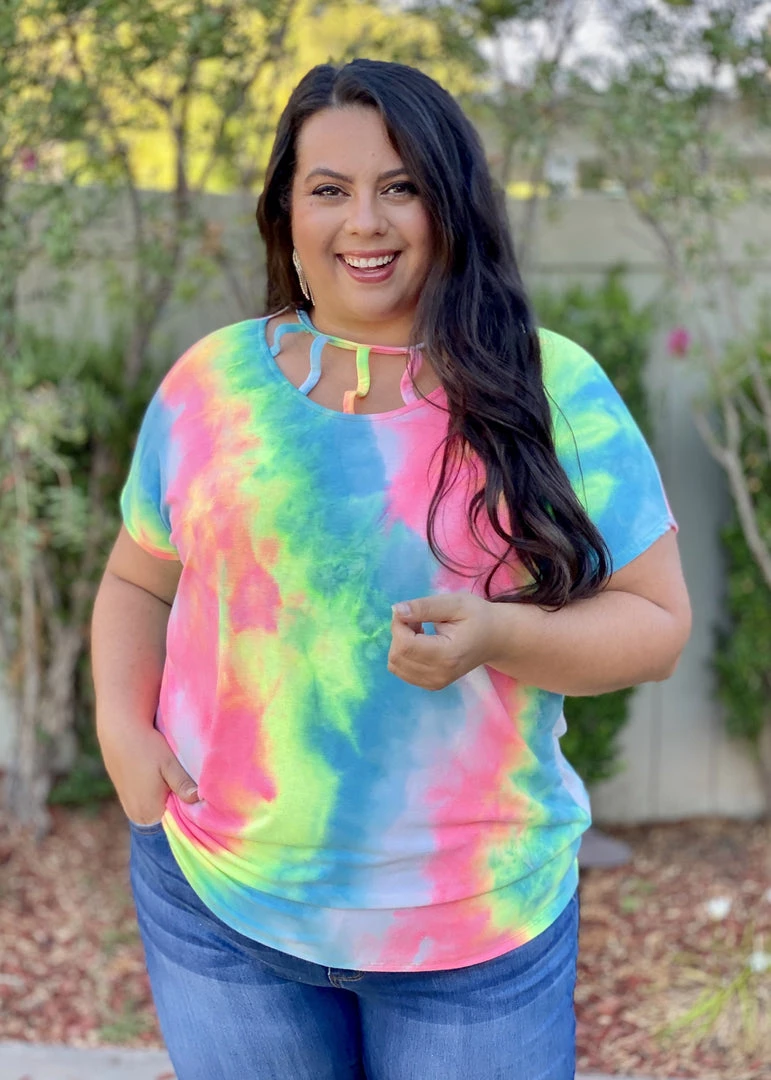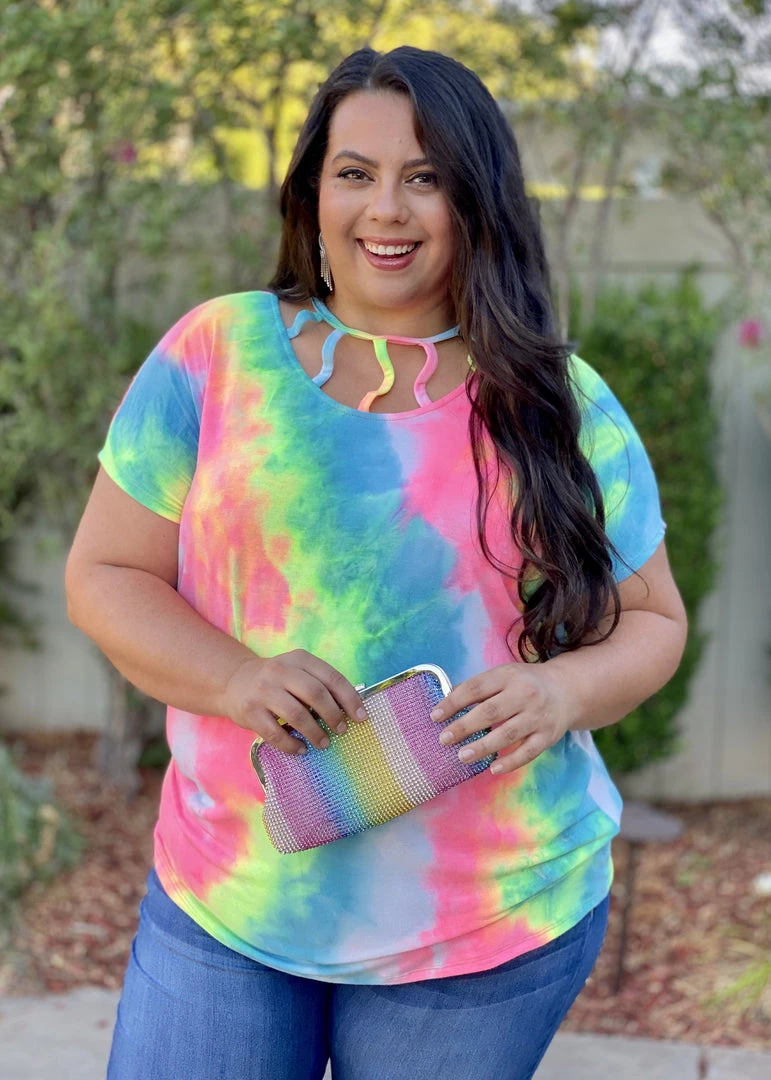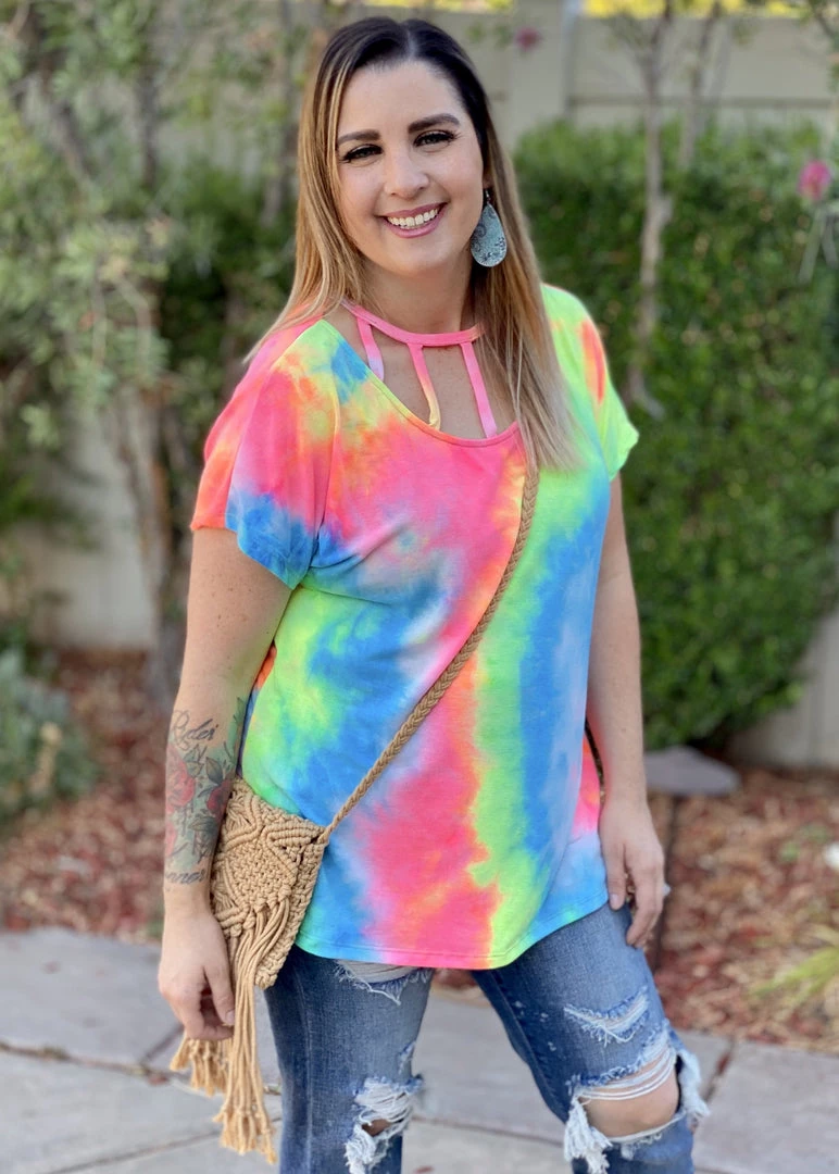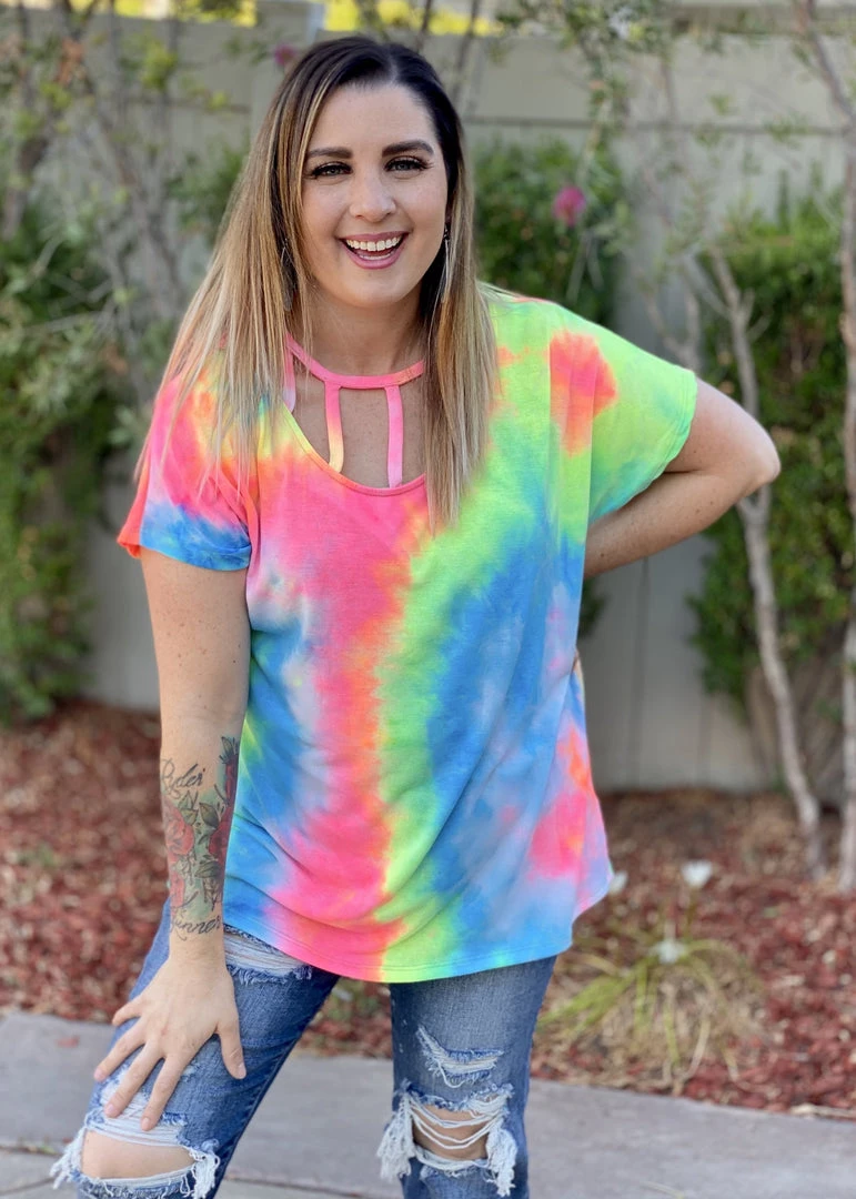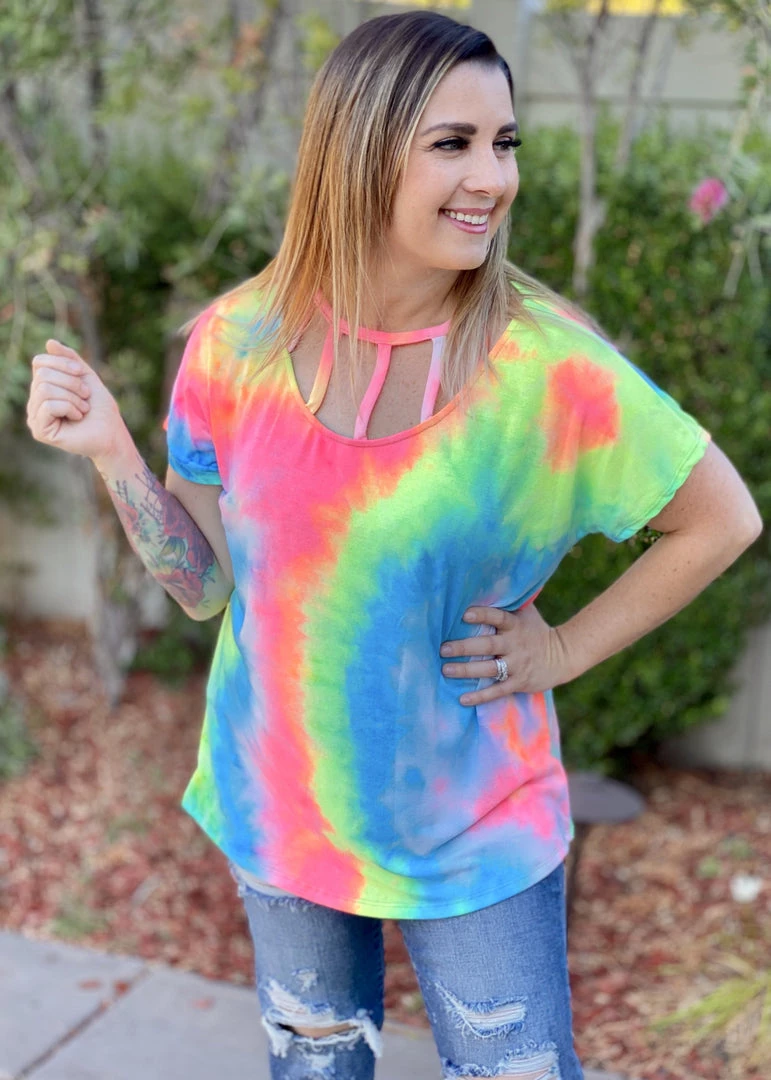 This top really raises the bar when it comes to this years tie dye fashion trend. With a relaxed fit, round neckline with self spaghetti strap trimΒ and short sleeves you’ll be sure to turn heads in this one.