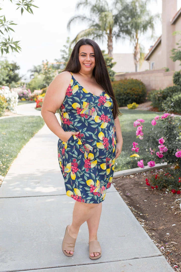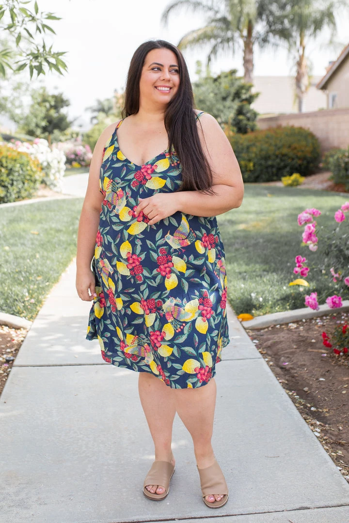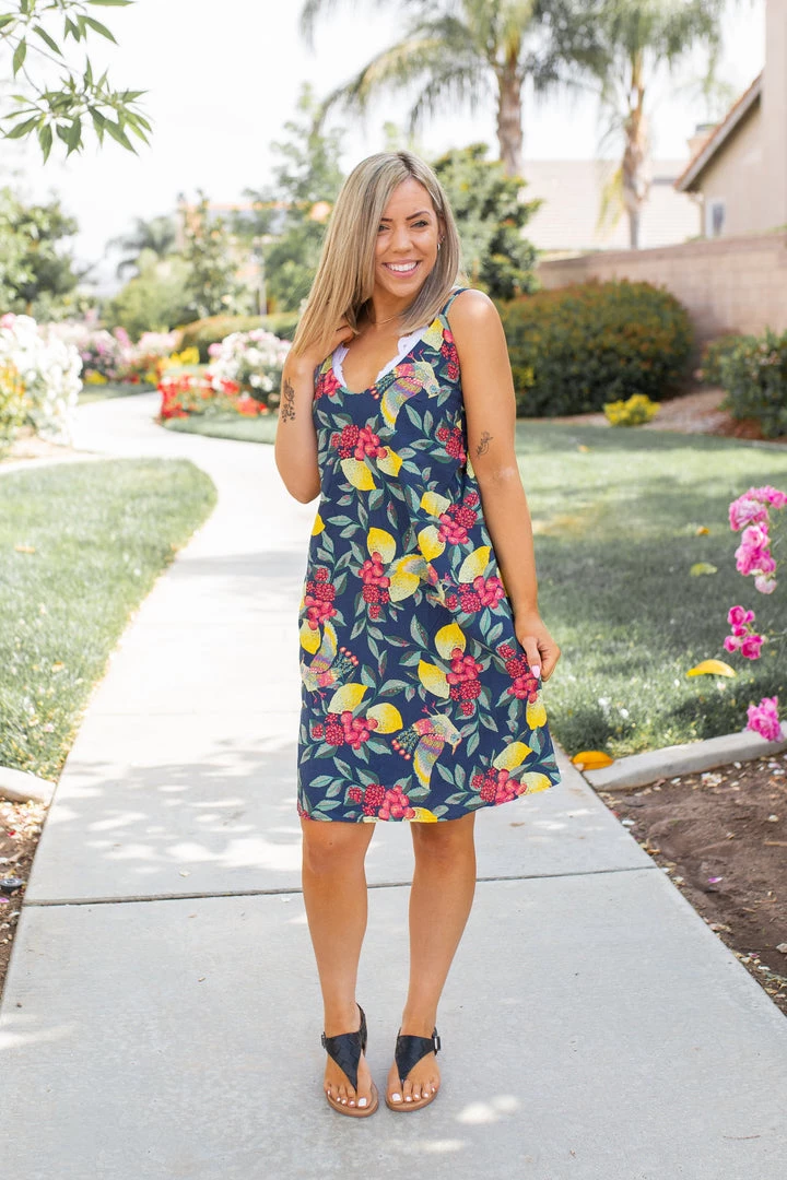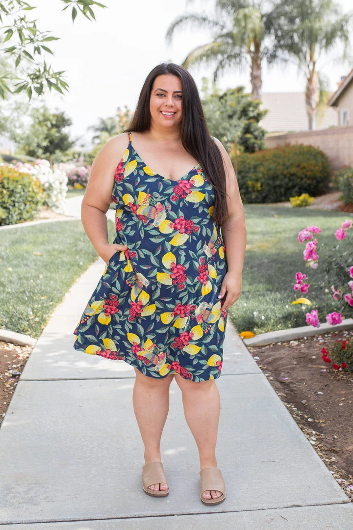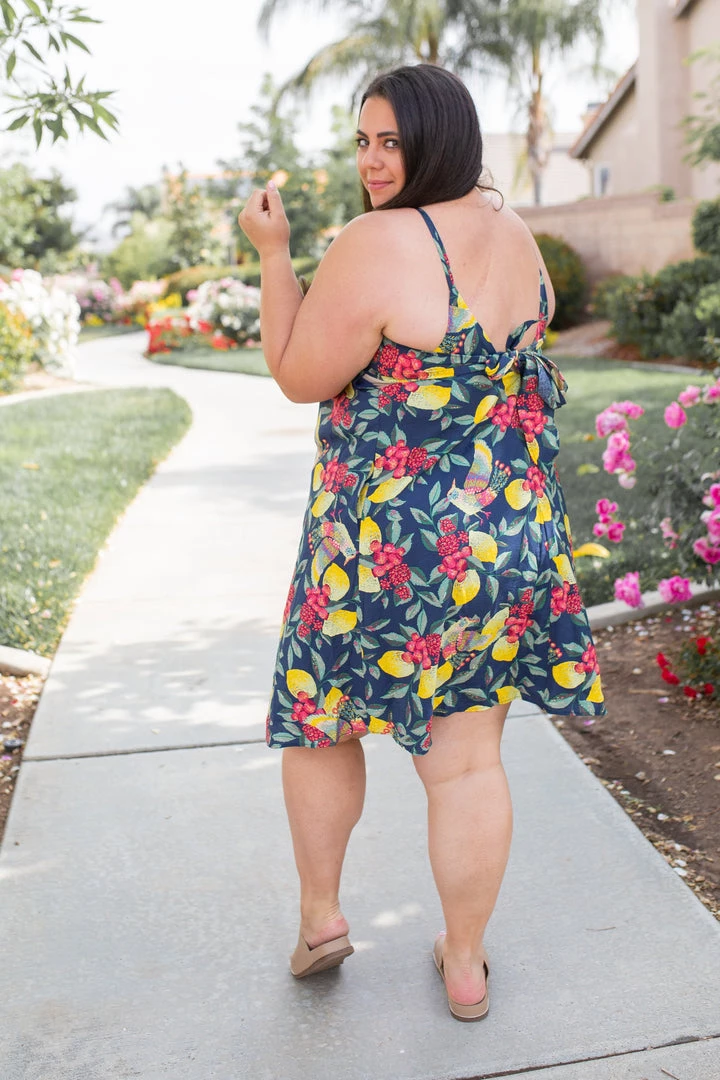 Like fresh squeezed lemons, this dress is as fresh as it gets. Seriously the perfect summer print with the lemons, berries and birds. With a relaxed fit, this dress has a self close tie in the back so you can really make it fit your body best. This dress is lined to perfection so there is nothing sheer about it, and it also has pockets!Β