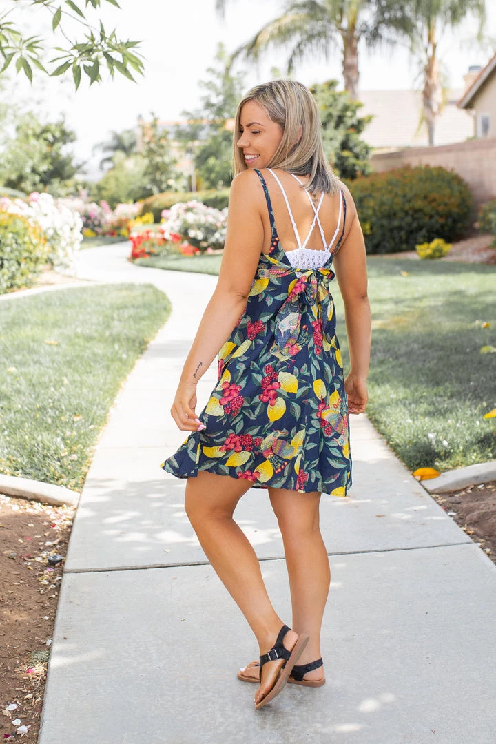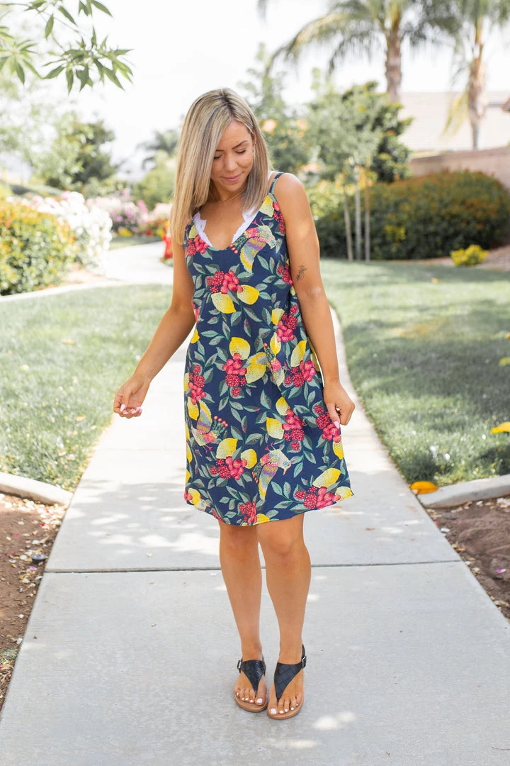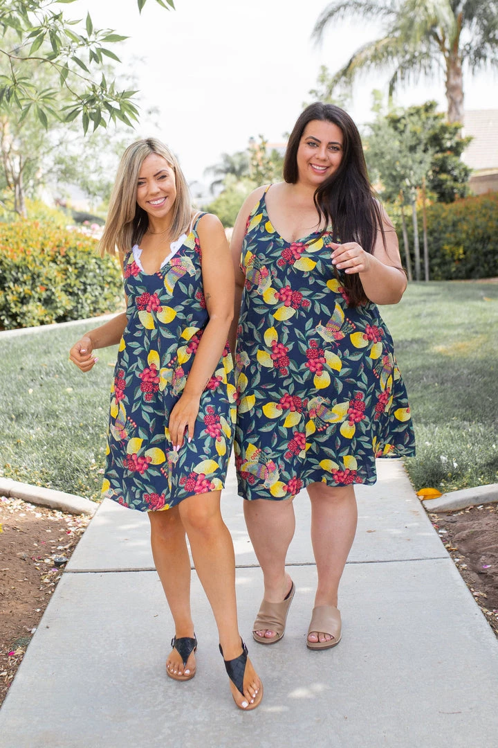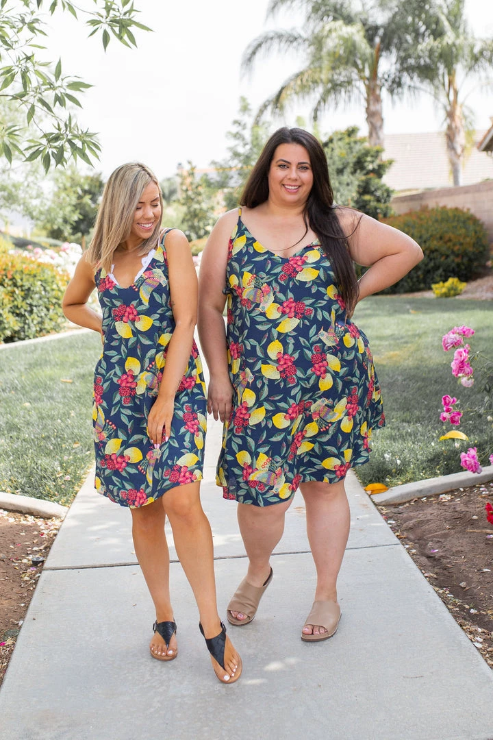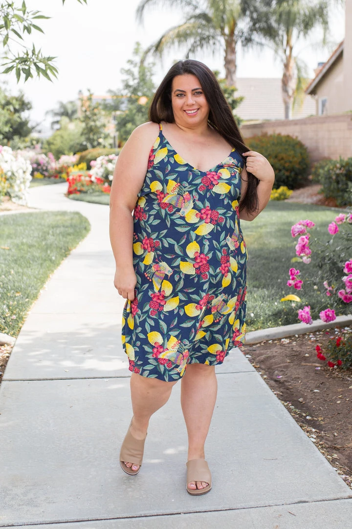 Like fresh squeezed lemons, this dress is as fresh as it gets. Seriously the perfect summer print with the lemons, berries and birds. With a relaxed fit, this dress has a self close tie in the back so you can really make it fit your body best. This dress is lined to perfection so there is nothing sheer about it, and it also has pockets!Β