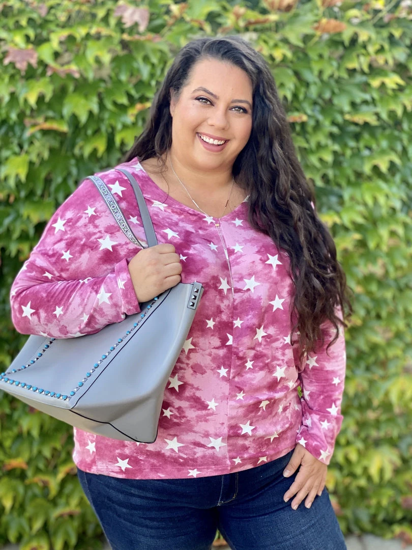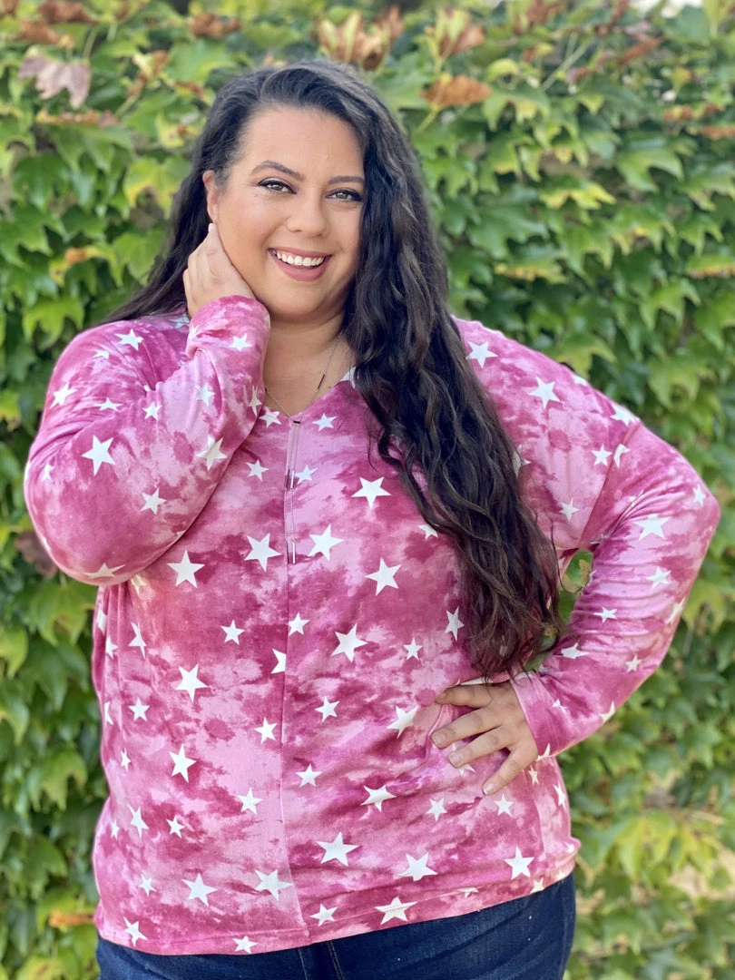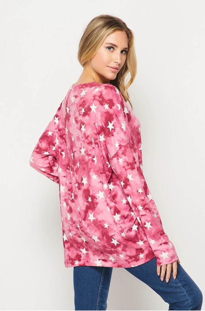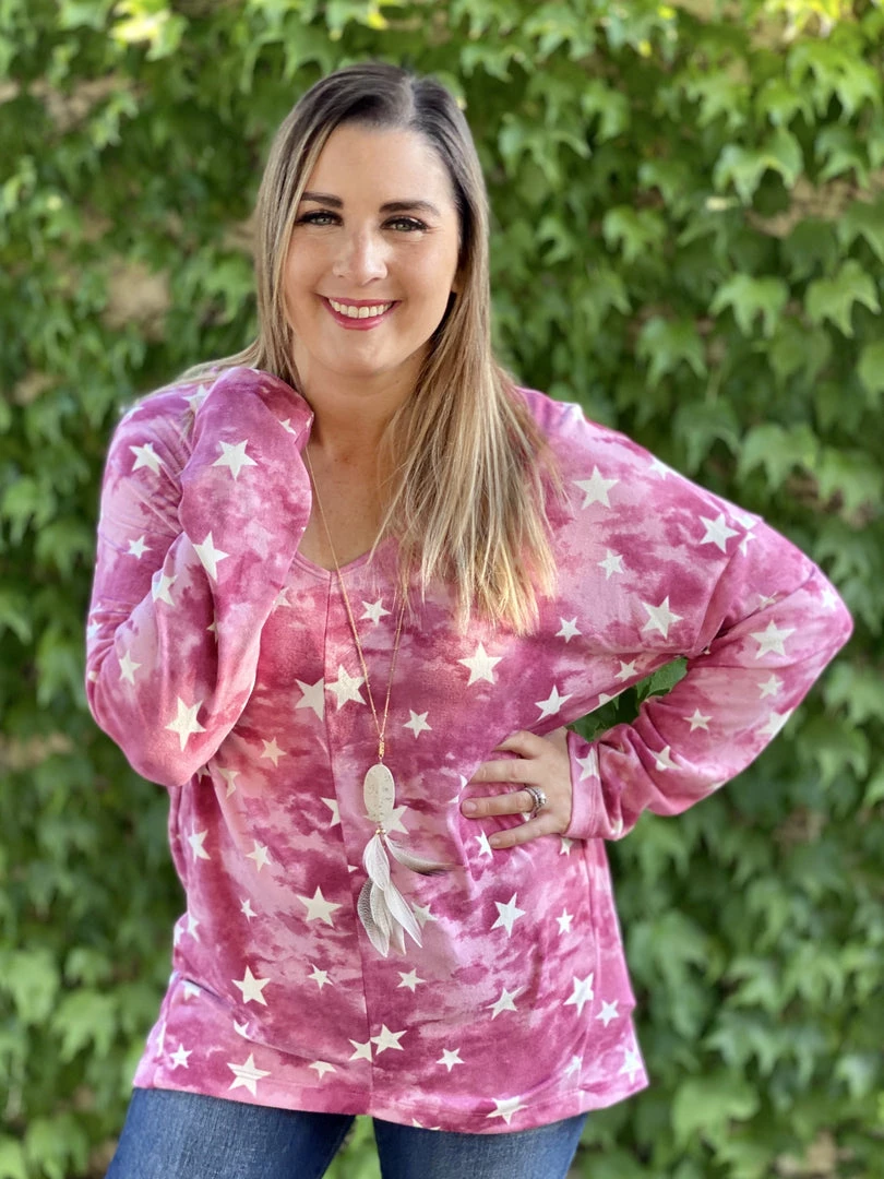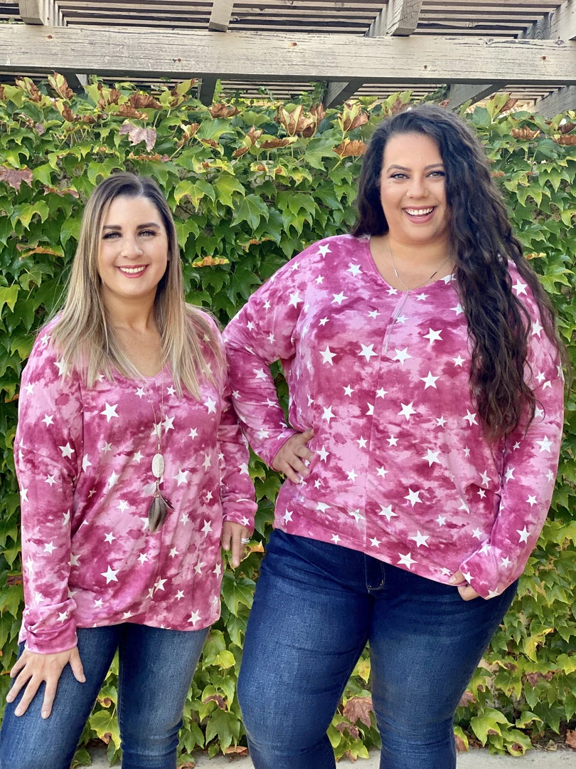 Shine like the brightest star in this stunning ruby tie dye long sleeve top. Featuring a v-neck, long dolman sleeves and relaxed fit, this top will pair perfect with just about anything!Β Β Β Β