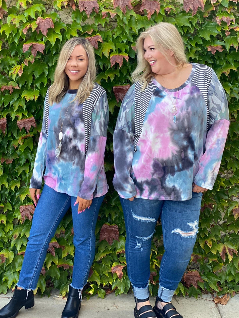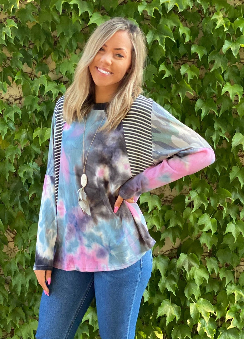Run wild in this gorgeous colorblock long sleeve thermal. Featuring stripe and camo color blockingΒ on this tie dye thermal, round neckline, long raglan sleeves and a relaxed fitΒ Β