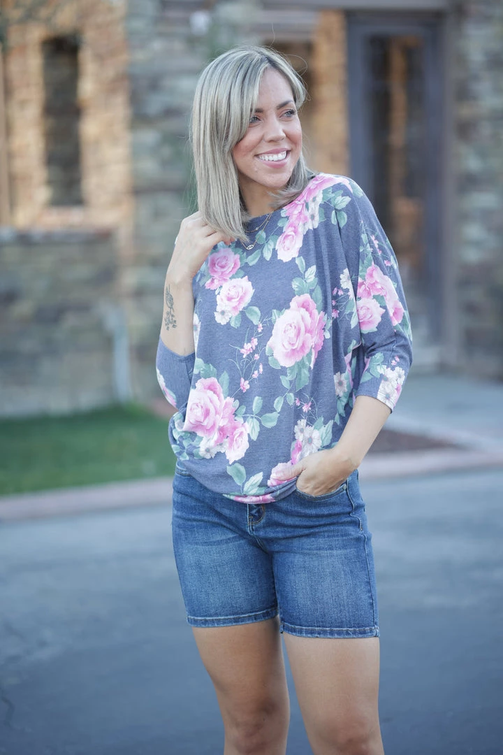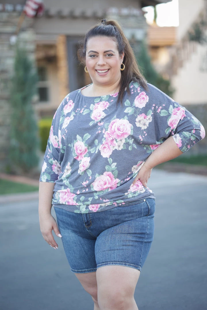 Slide right into spring without a hitch in this gorgeous ruched floral dolman. With a relaxed fit, this top features 3/4 dolman sleeves, a boat neck and fitted bottom with ruched sides.Β Β Β Β