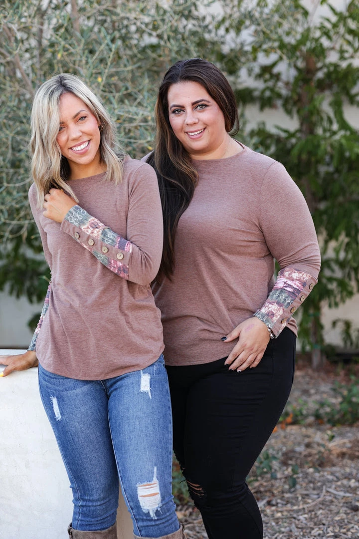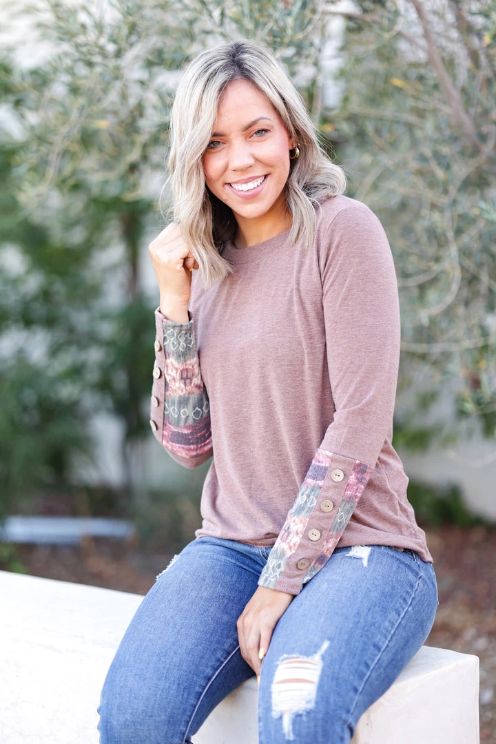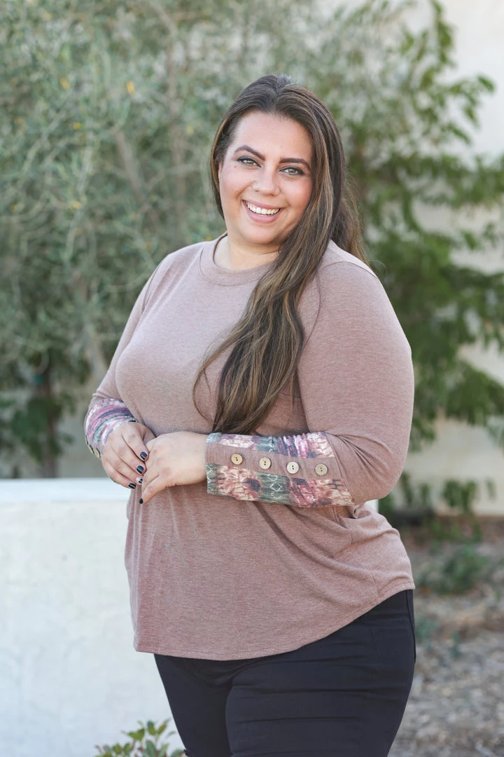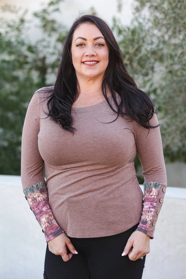 This two tone mocha long sleeve top has the most amazing tie dye cuffs with button details. With a semi relaxed fit, this top features a round neckline, long sleeves and rounded hem.