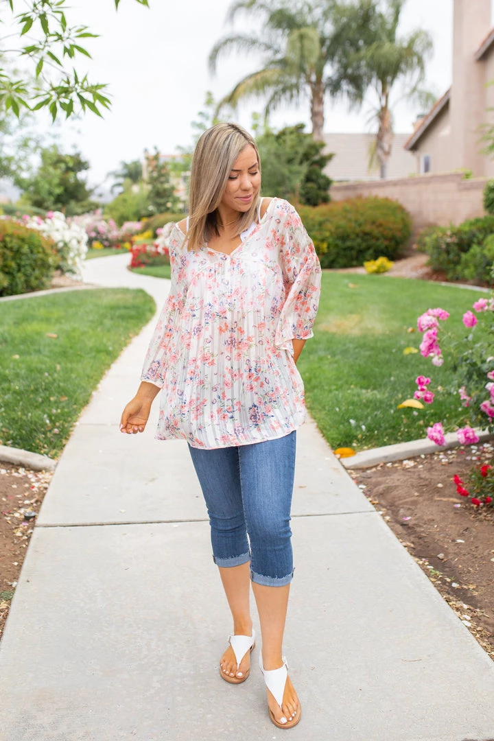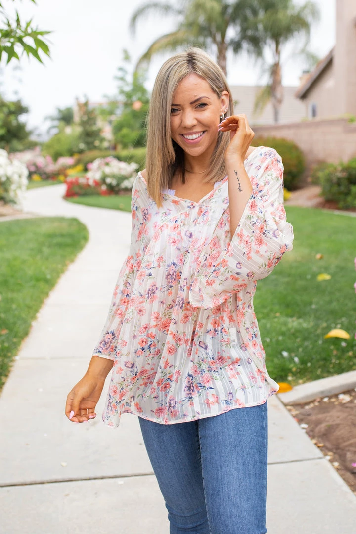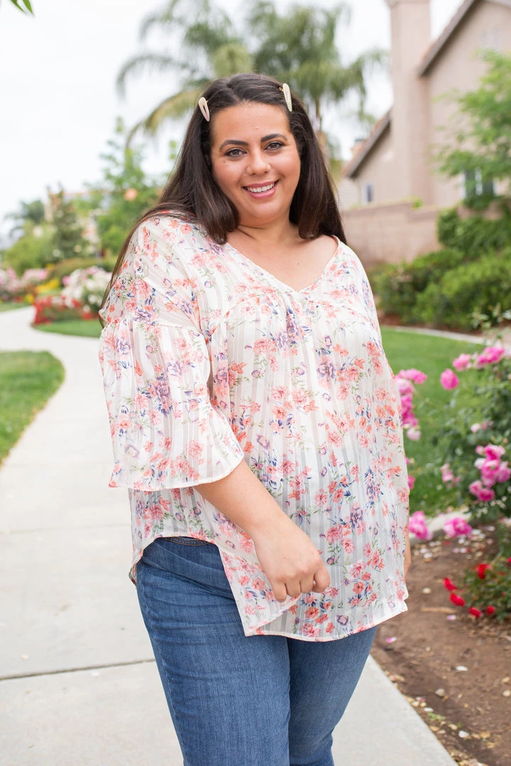 You’re sheer to love this short sleeve top. It’s seriously the perfect lightweight top for those hot days. The floral print against the subtle striping and that gold stitching really makes this piece one of a kind. With an oversized fit, this top features a v-neck, short bell sleeves and a rounded hem.Β