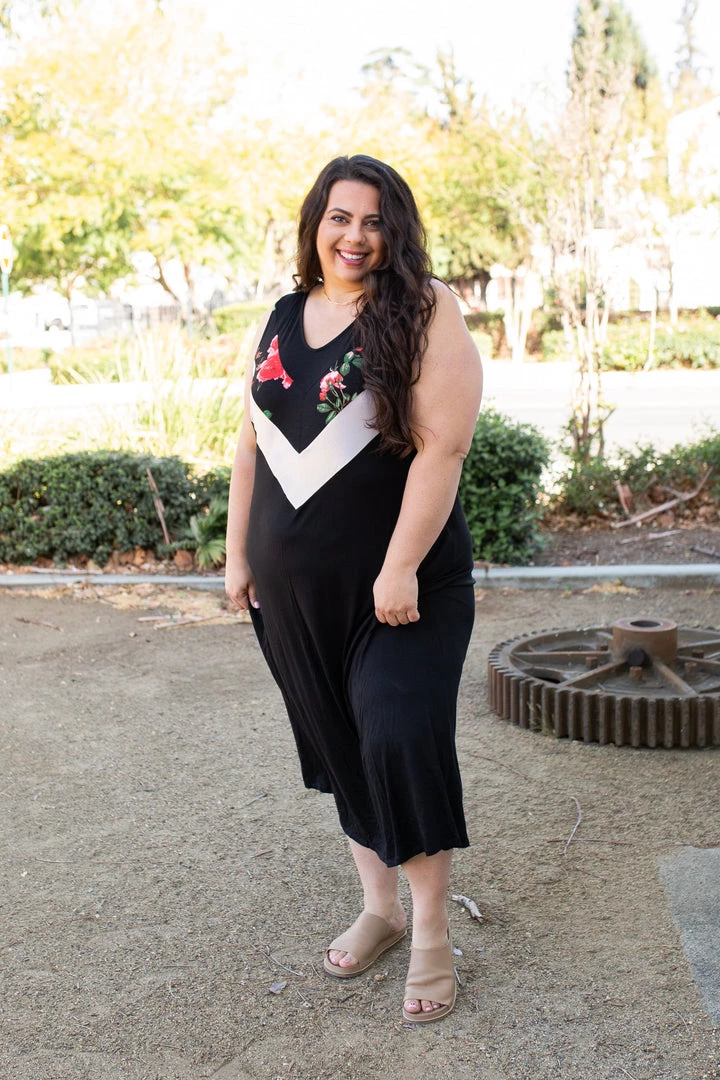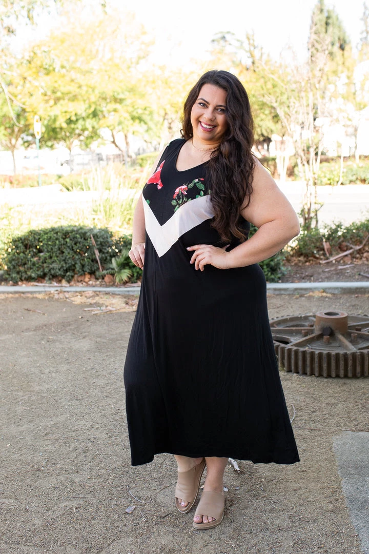 Shine like the beautiful rose you are while wearing this amazing sleeveless maxi dress. Made from a soft jersey fabric, this dress features no fuss straps, a v-neck and floral and shimmery colorblocking.Β
