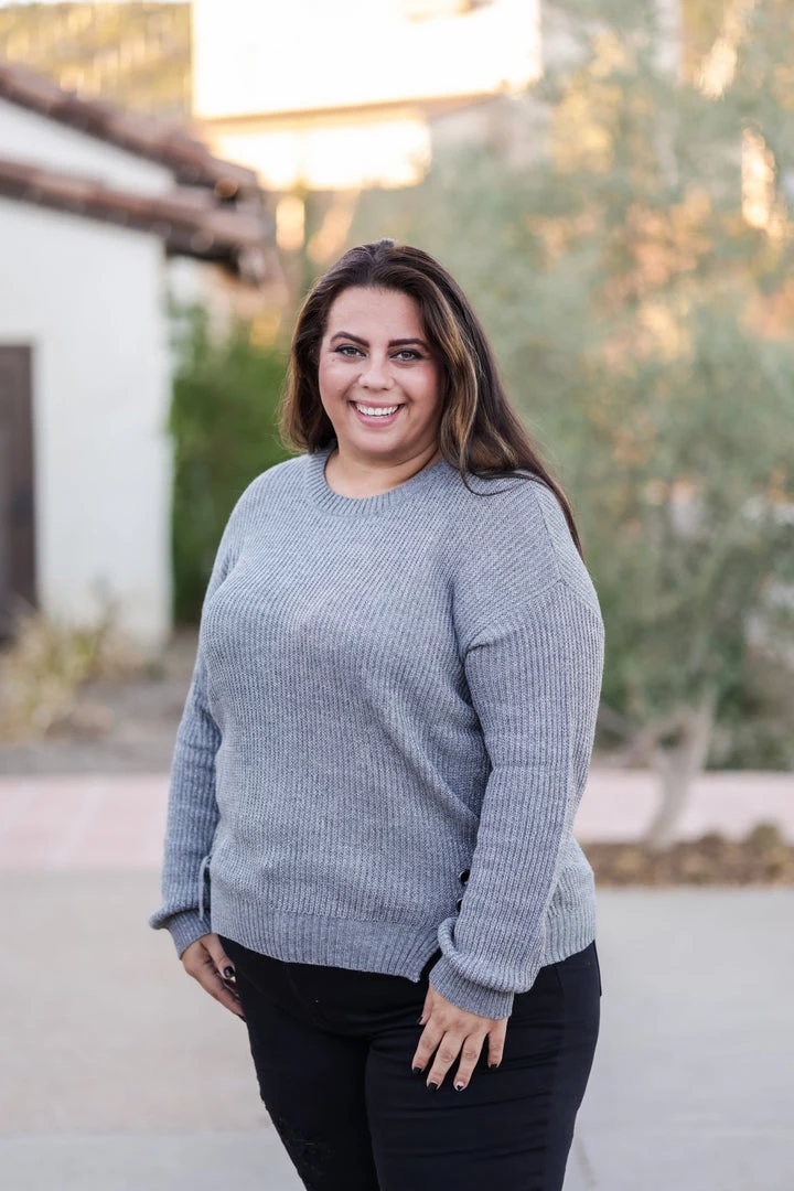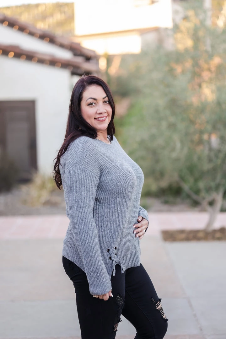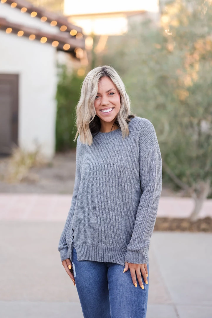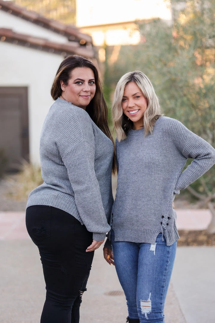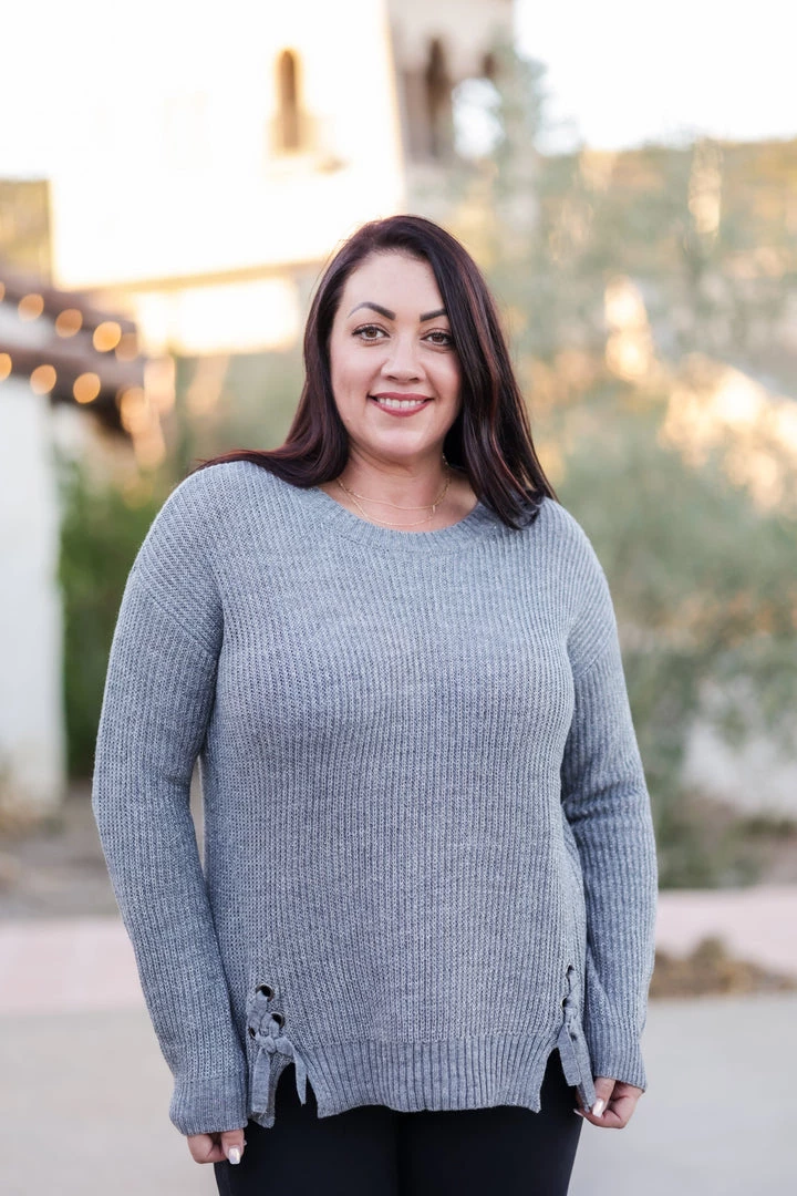One of our favorites of the season! Thi long sleeve knit pullover is stitched with the most amazing silver threading throughout. With a relaxed fit, this pullover features a round neckline, long sleeves and hi lo hem with lace up details.Β