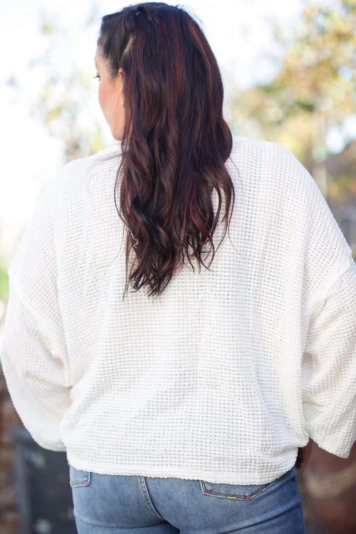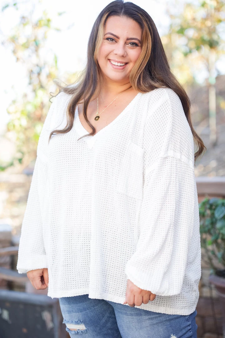 This waffle knit top is as gorgeous as new fallen snow. The oversized boxy fit, makes it so easy to pair with just about anything and the waffle knit is as soft as a fluffy cloud. Featuring a v-neck, balloon sleeves and front pocket.