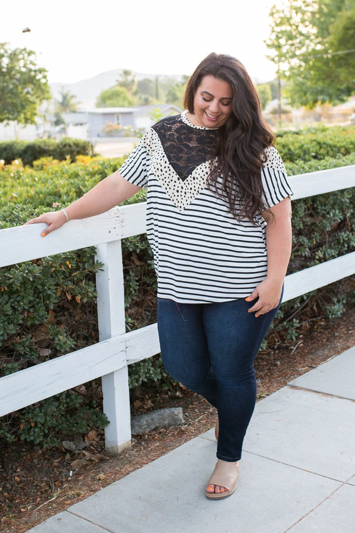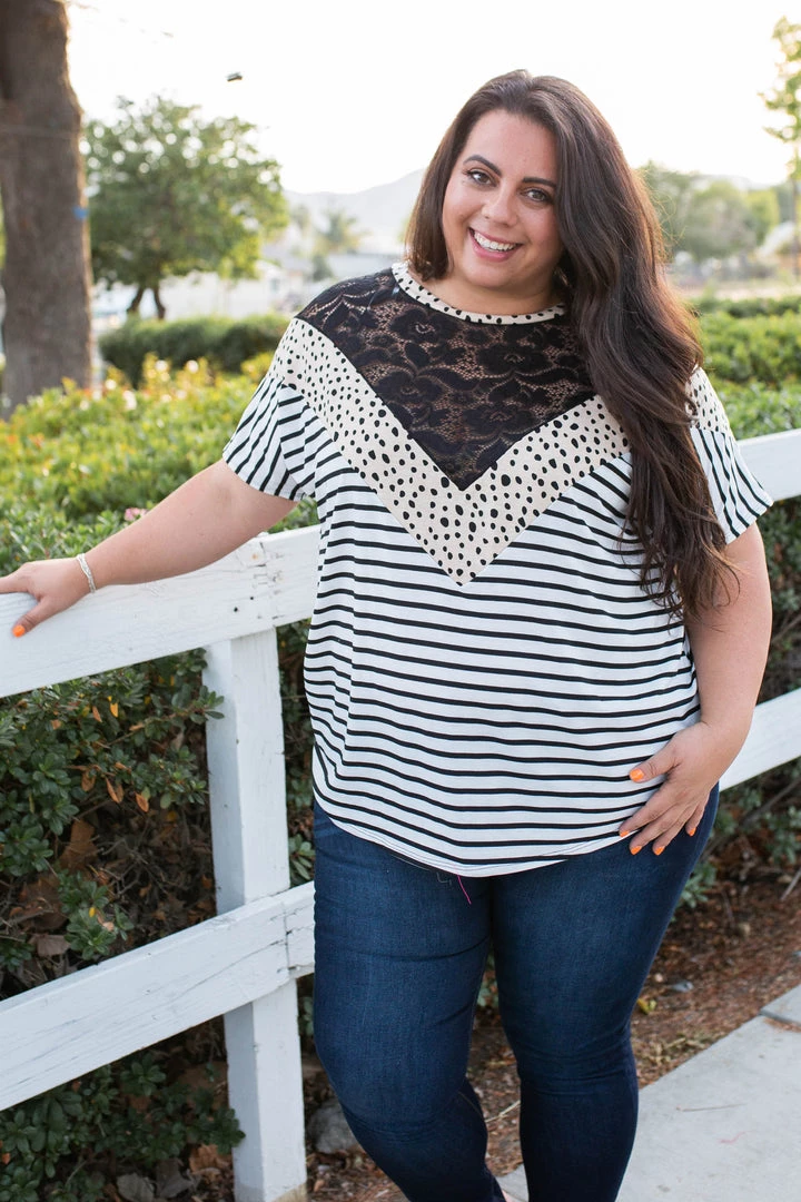 There are so many reasons why we are in love with this top, and we know you will love it just as much. With a relaxed fit, this top features a unique chevron colorblock with lace, short dolman sleeves and a rounded hem.
