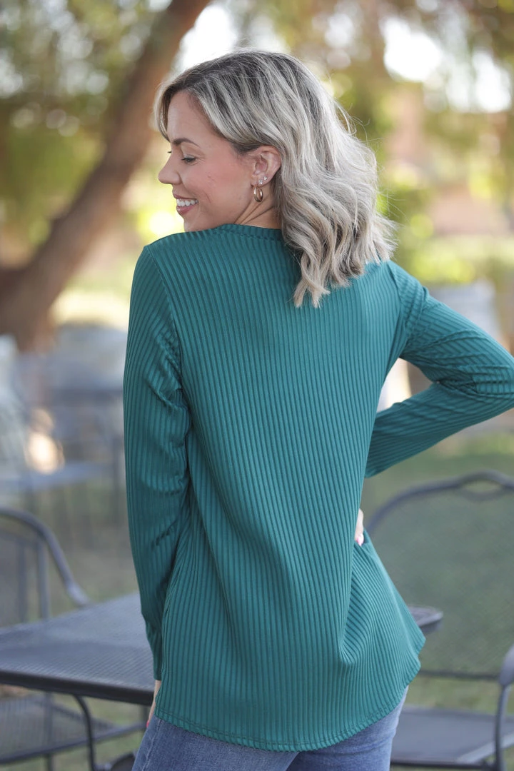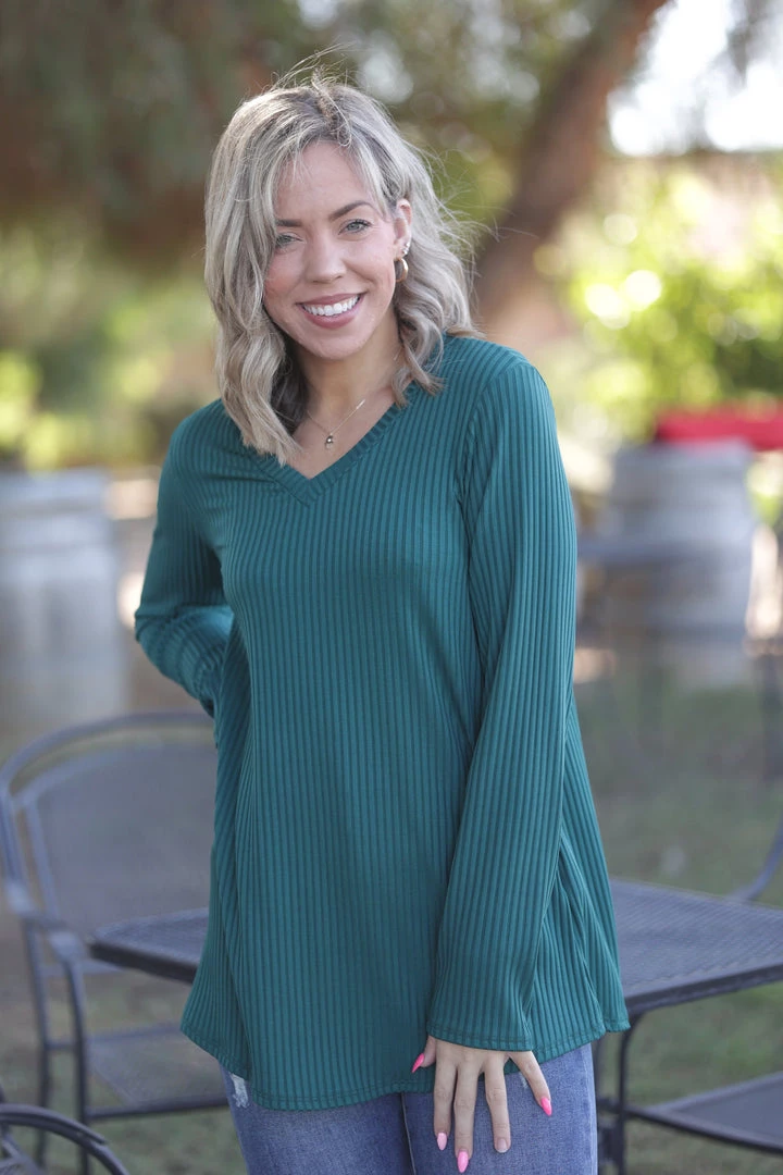 The subtle stripes in this long sleeve top really gives it such a unique look. With a relaxed fit, this top features a v-neck, long sleeves and rounded hem.