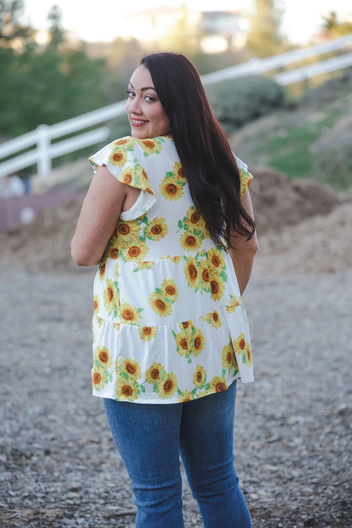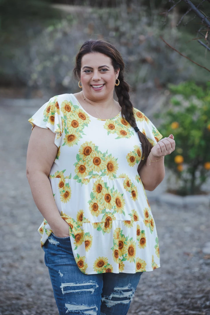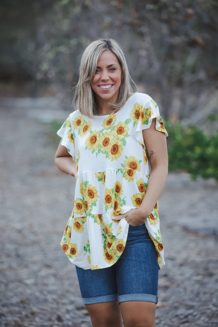 We can’t get over how amazing this sunflowerΒ tiered tunic is! Made from a lightweightΒ jersey fabric, this top features aΒ round neckline, short flutter sleevesΒ and tieredΒ hem.Β