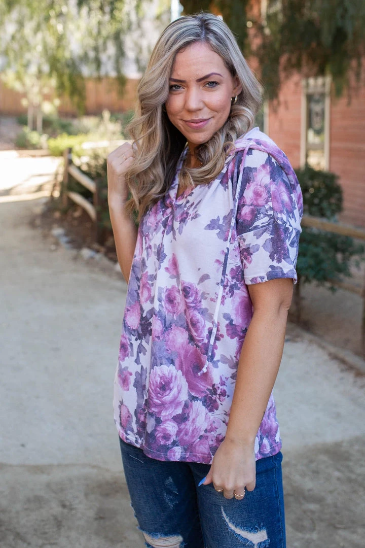 We are absolutely swooning over this short sleeve hoodie! The floral print is absolutelyΒ to die for. With an oversized fit this top will pair well with just about anything and features a v-neck and hood with functioning drawstrings.Β